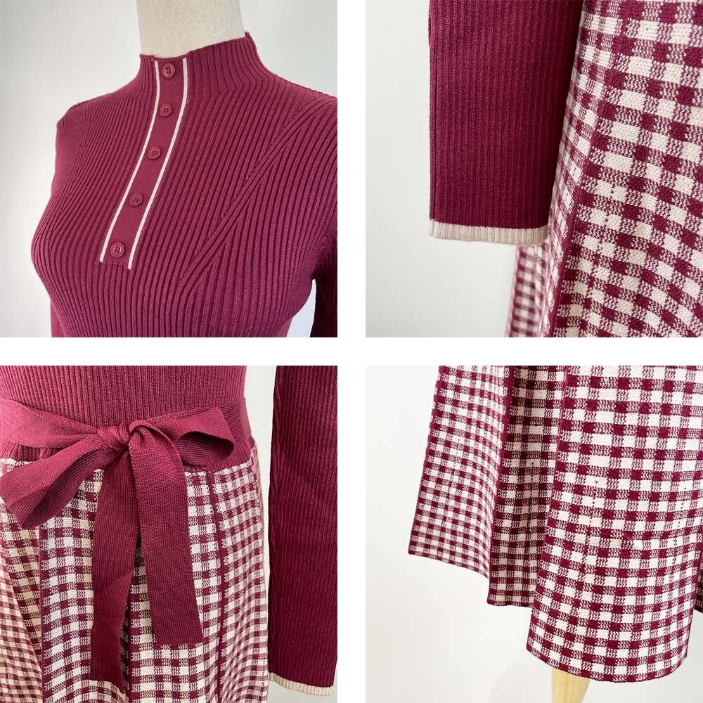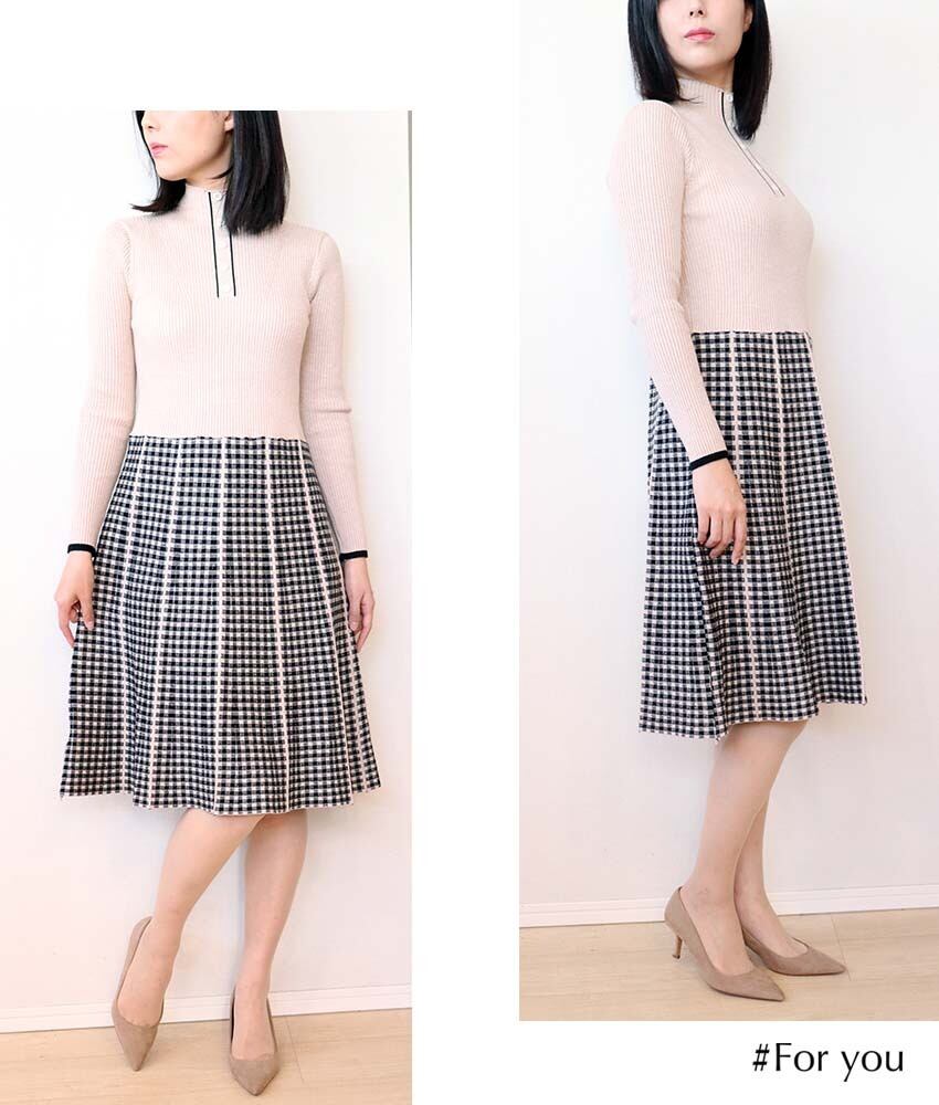 チェック柄スカート×ボタン付きハイネックのドッキングニットワンピース。ベルト紐付きで、大人可愛いシルエットに。スカート部分は大きなプリーツ型で、メリハリがあります。