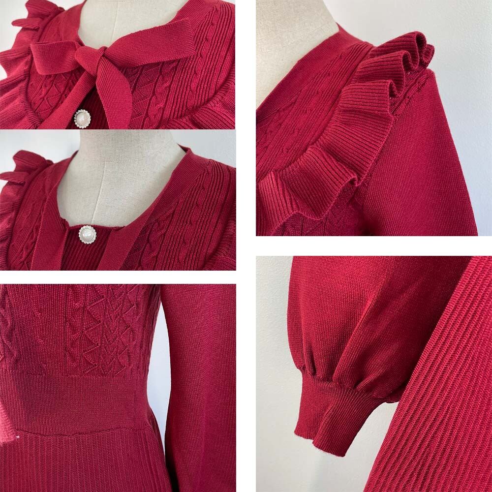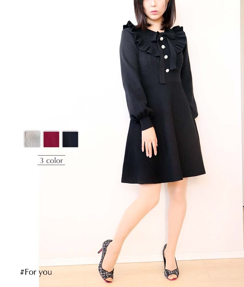 Aラインのニットワンピース、デコルテのフリルデザイン+ボタン+リボンが可愛らしい印象に。大きめのプリーツデザインが大きく揺れてセクシーです。