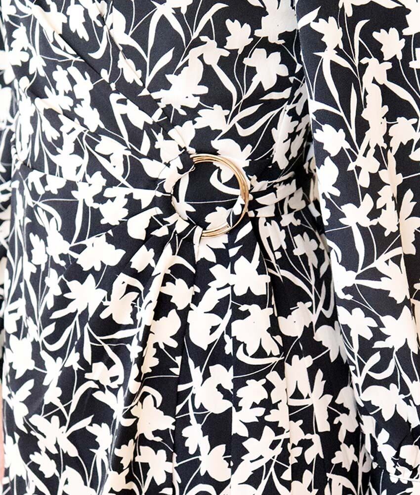 花デザインが全体にプリントされたシックなワンピース。サイドでベルト締めするスタイルでオシャレスタイルに。1枚で華やかな印象に。