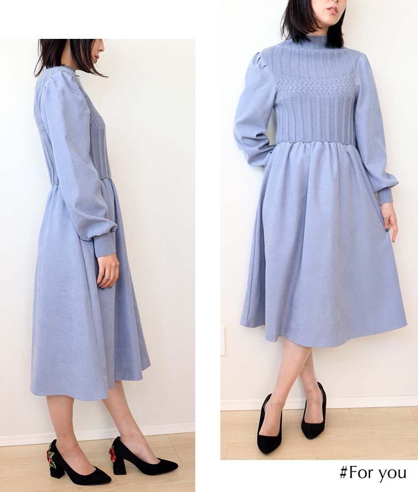 ハイネックのフェミニンワンピース。トップスの部分だけ伸縮性のあるニット素材で、その他はスエード生地です。冬コーデの定番に重宝します。
