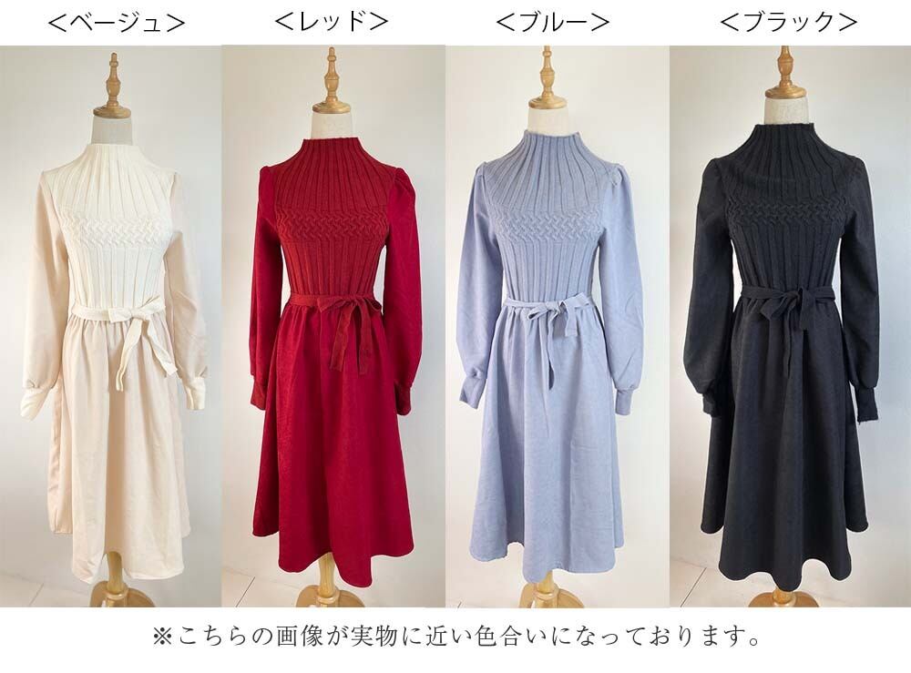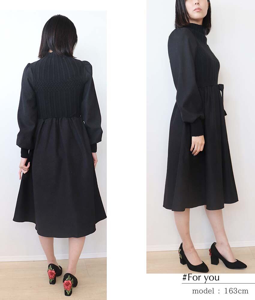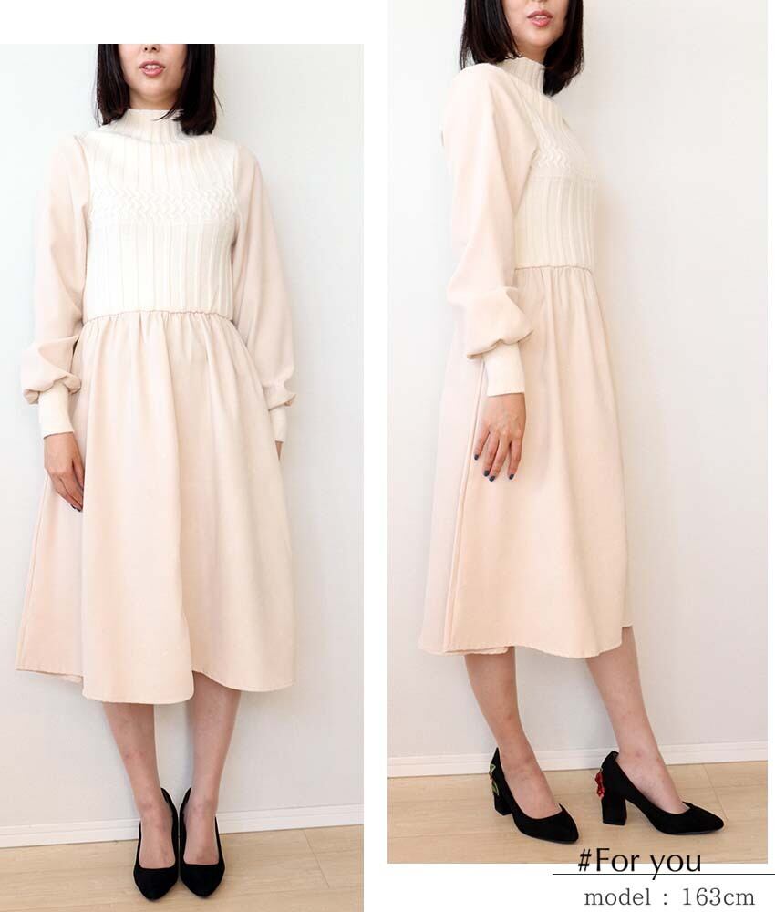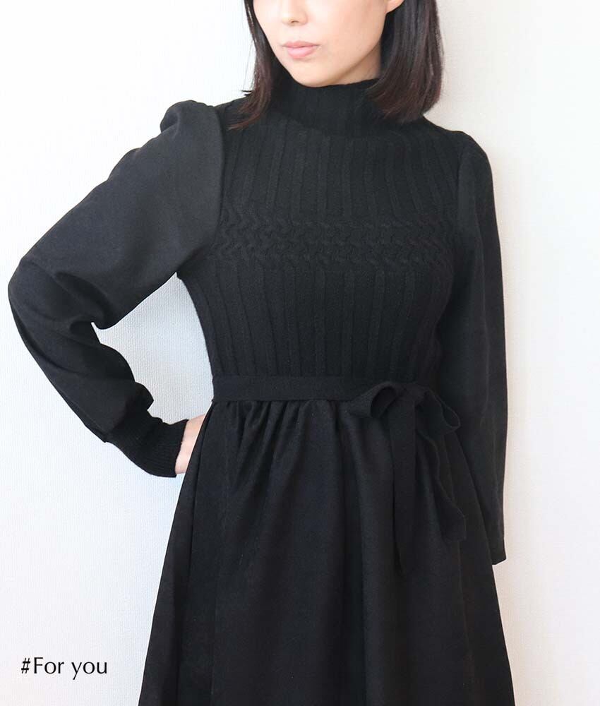 ハイネックのフェミニンワンピース。トップスの部分だけ伸縮性のあるニット素材で、その他はスエード生地です。冬コーデの定番に重宝します。