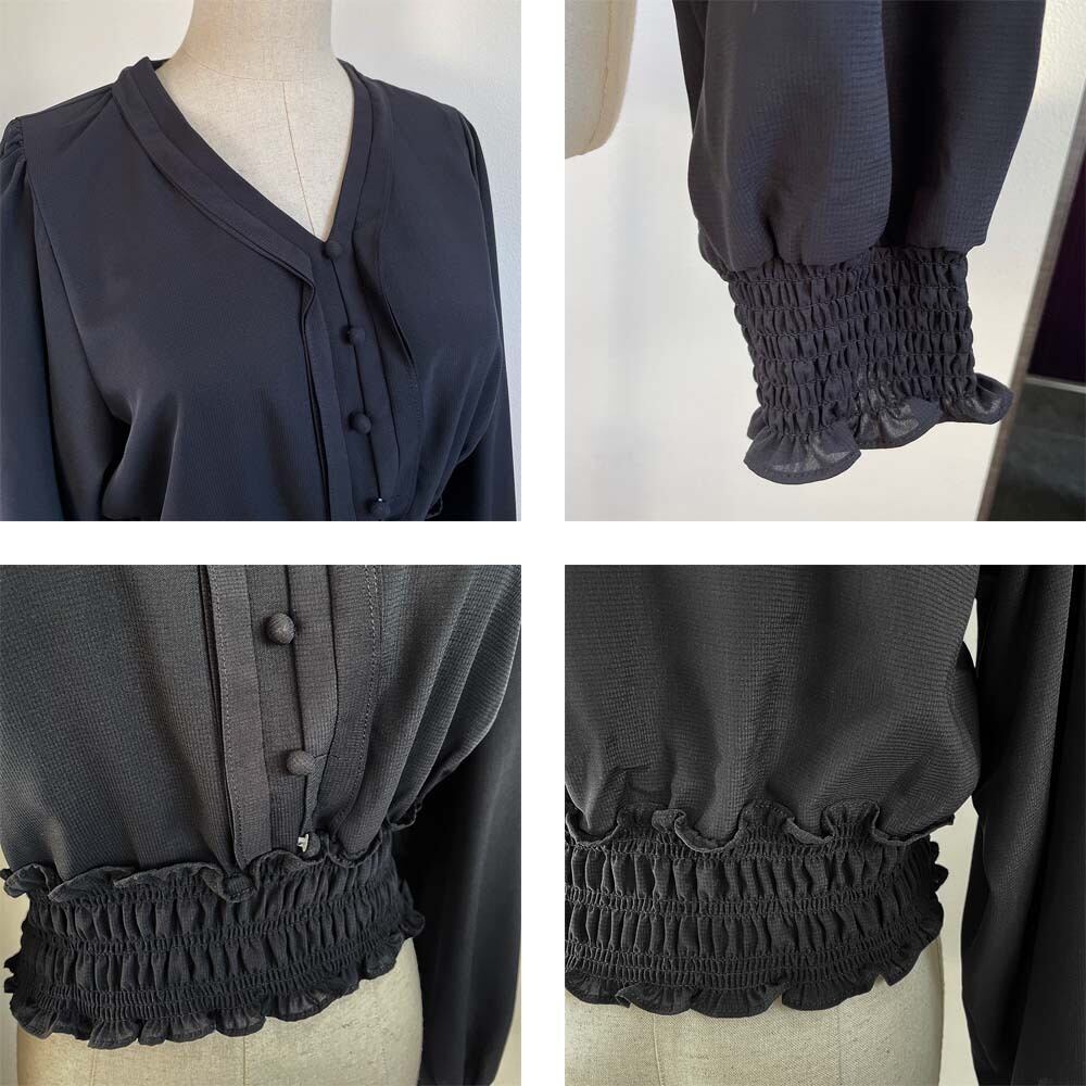 薄手のハイウエストのトップス。袖元とウエストの大きな絞りデザインが、スタイルアップの鍵。袖もゆったりしたデザインなので、ふんわりした柔らかい印象に。