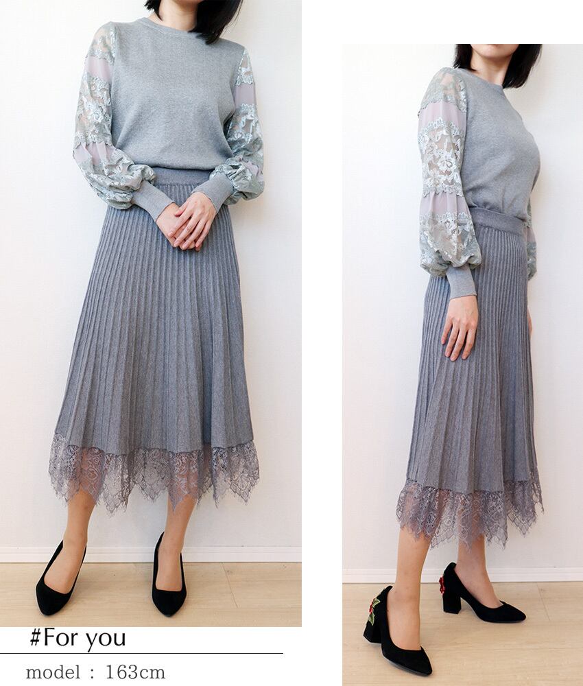 裾のレースが上品なニットスカート。流行りのロング丈でトレンド感も演出。