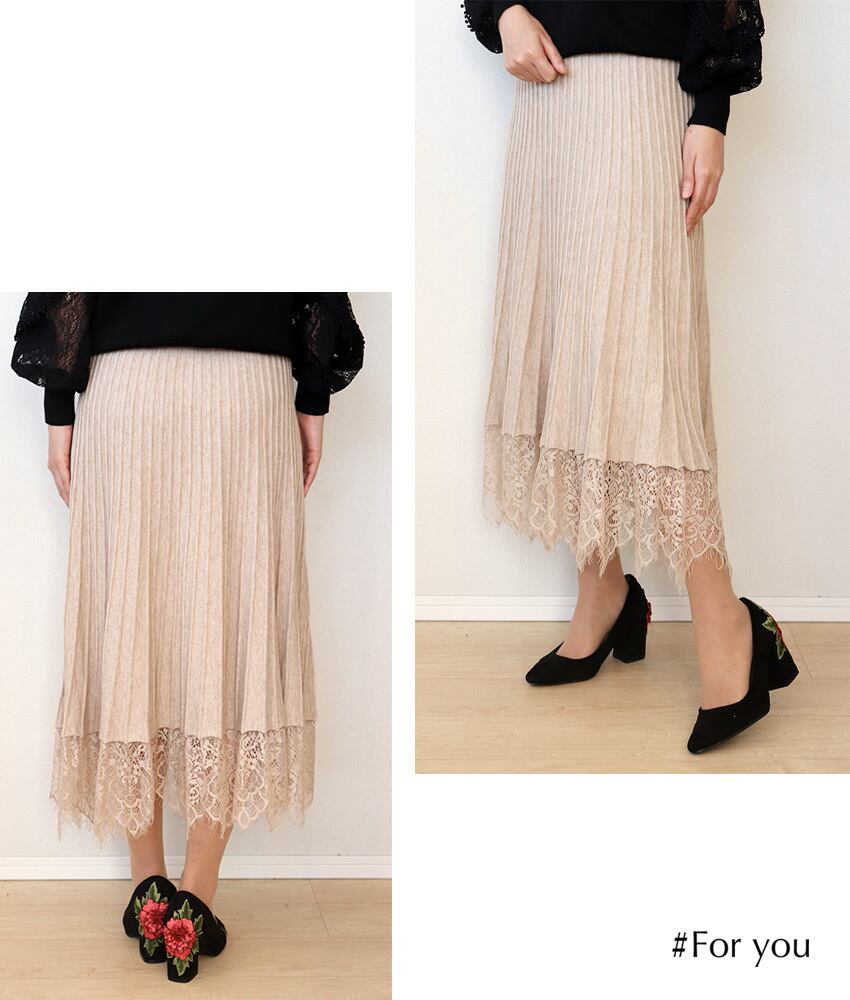裾のレースが上品なニットスカート。流行りのロング丈でトレンド感も演出。