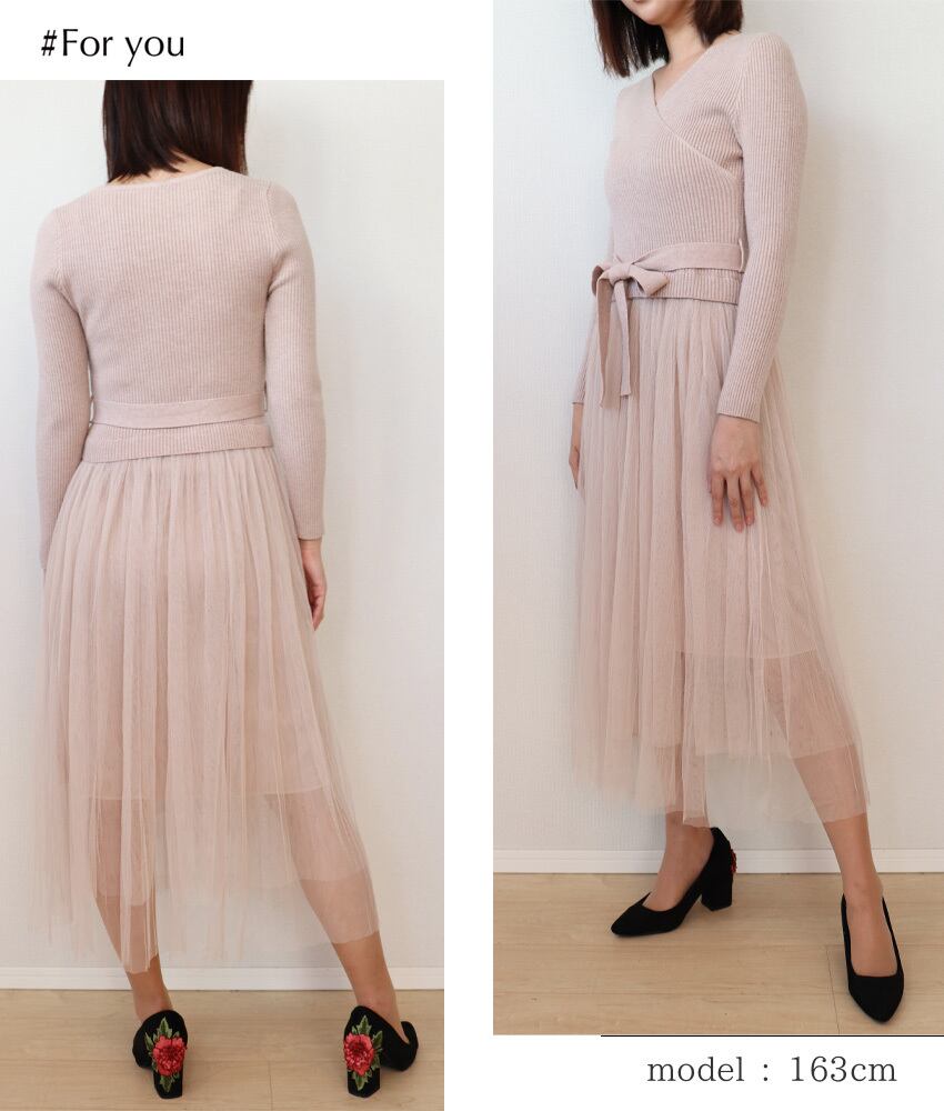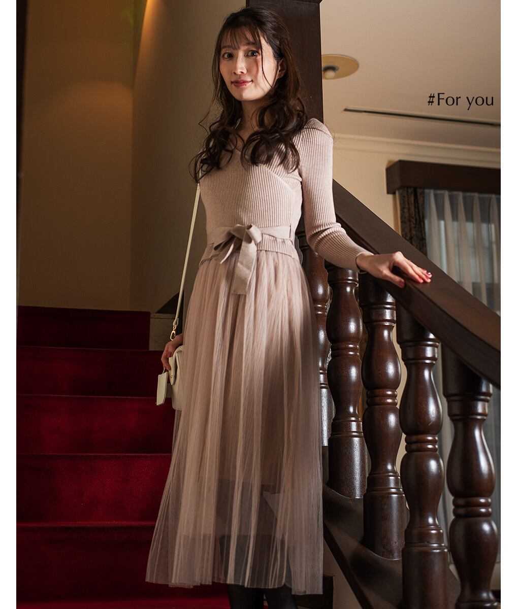 1枚でおしゃれ上級者になれるドッキングワンピ。歩く度に揺れるチュールスカートがフェミニンさをアピール。