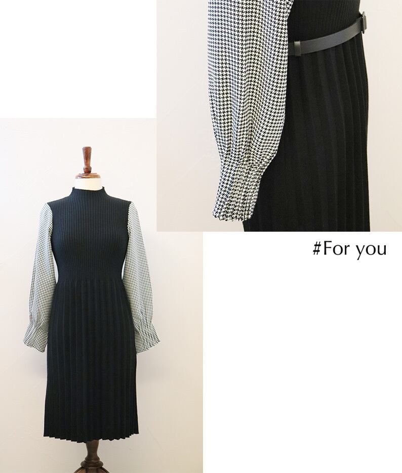 ゆとりある千鳥柄の袖とピタッとしたラインがきれいなワンピース。ベルトでさらにスタイルアップできちゃう。