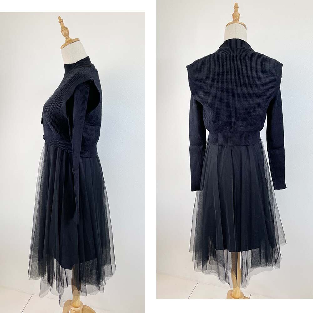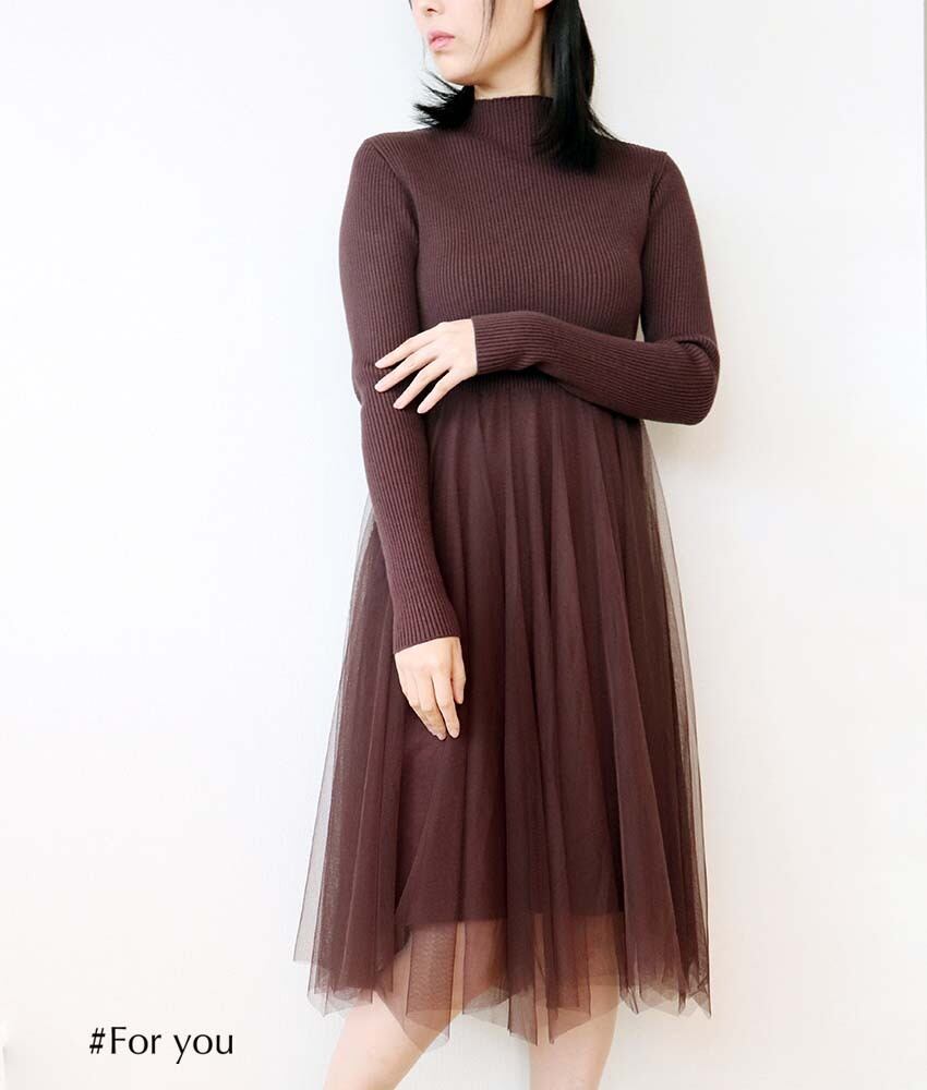 ニット×チュールのドッキングワンピース。ニットベストがセットになった、完成されたコーディデートです。タートルネックなので、冬コーデにバツグン。女性らしく仕上げてくれます。