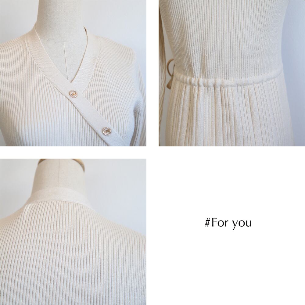 裾レースに目が行く可愛い+て大人っぽさを取り入れたニットワンピース。ウエスト部分はクシュっと調節できるベルト紐がついているので、ウエスト引き締め効果も◎