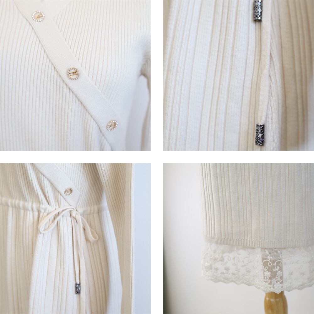 裾レースに目が行く可愛い+て大人っぽさを取り入れたニットワンピース。ウエスト部分はクシュっと調節できるベルト紐がついているので、ウエスト引き締め効果も◎