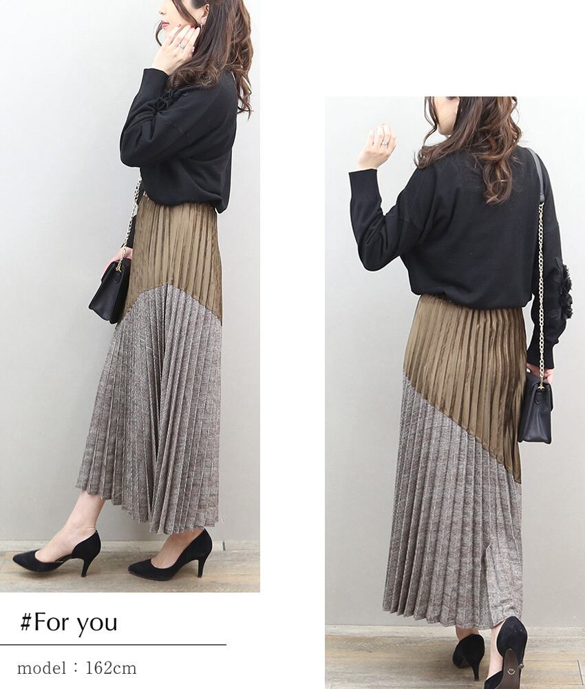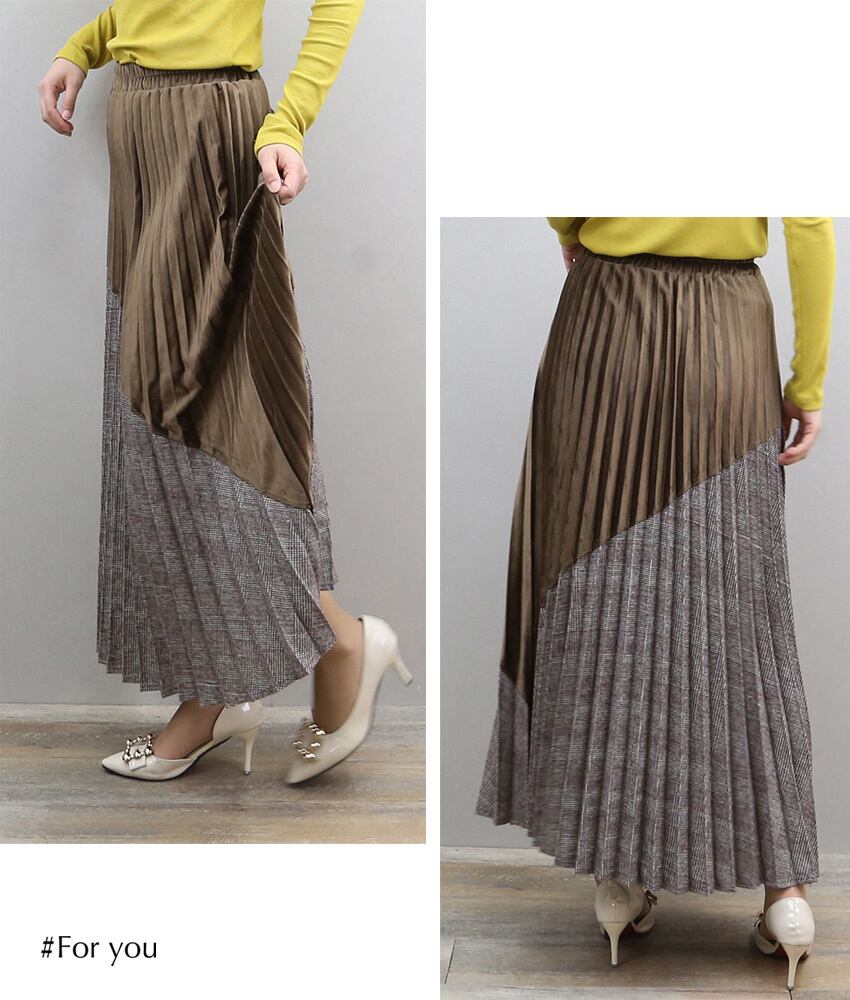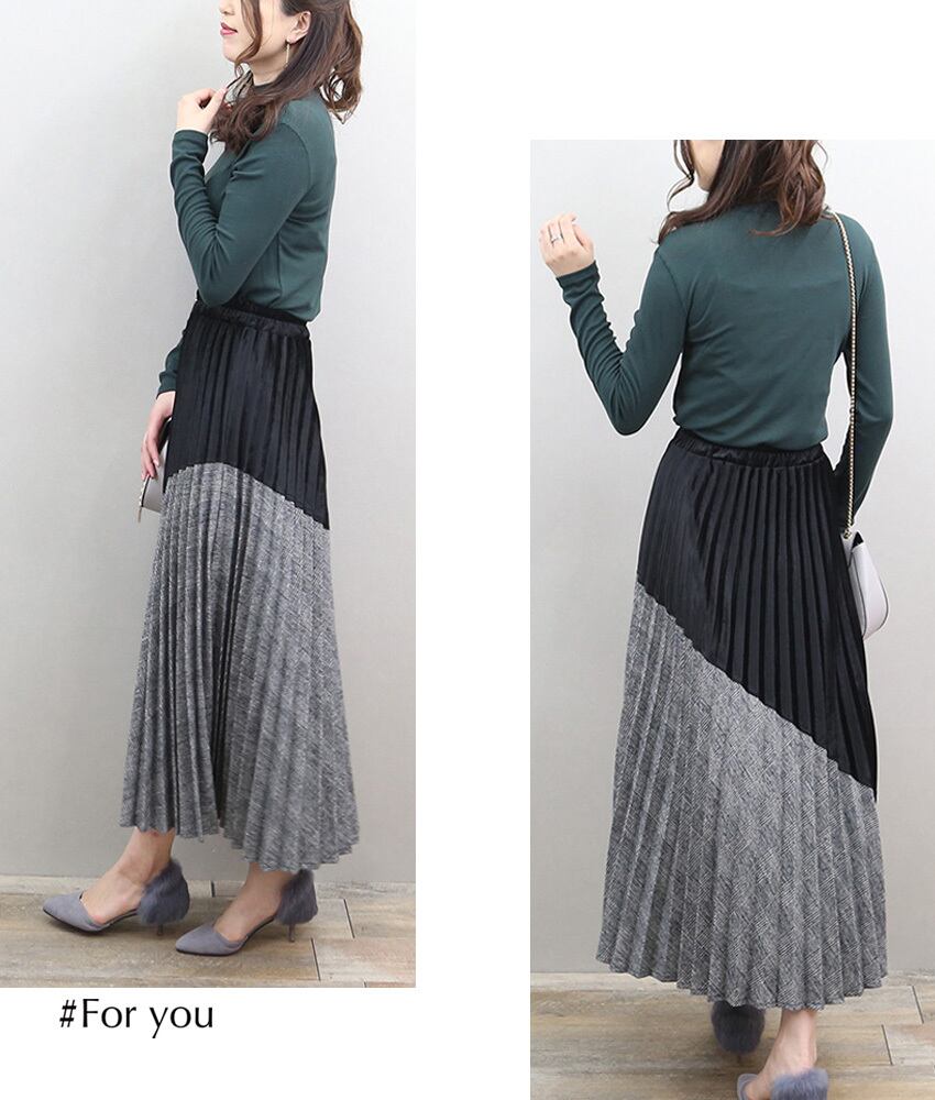 斜めの切替デザインが、脚長効果を引き立たせてくれます。ウエストゴムのなので、ゆったり着用できます。細かいプリーツがシックで、大人っぽく仕上がります。