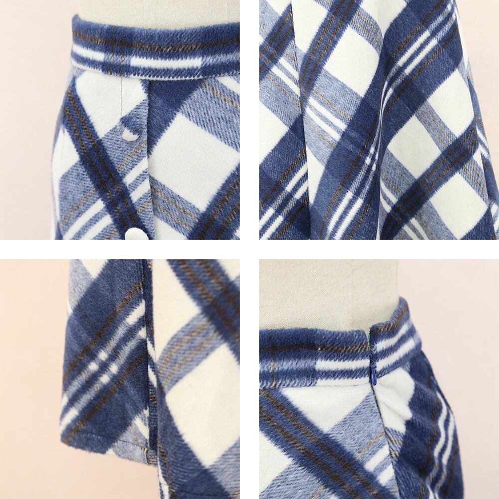 大胆なチェック柄にまとわれたウール素材のスカート。フロントボタンもオシャレポイントです。左側にファスナーがあり、キュッと引き締まったきれいなウエストを見せてくれます。