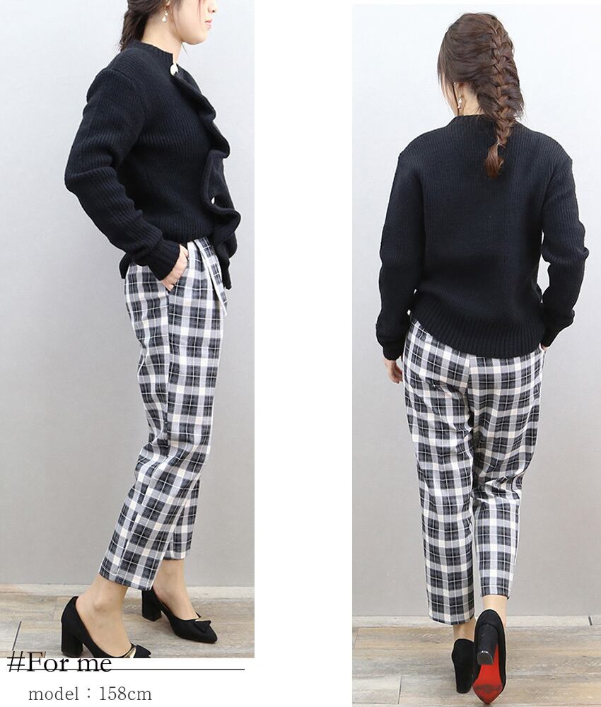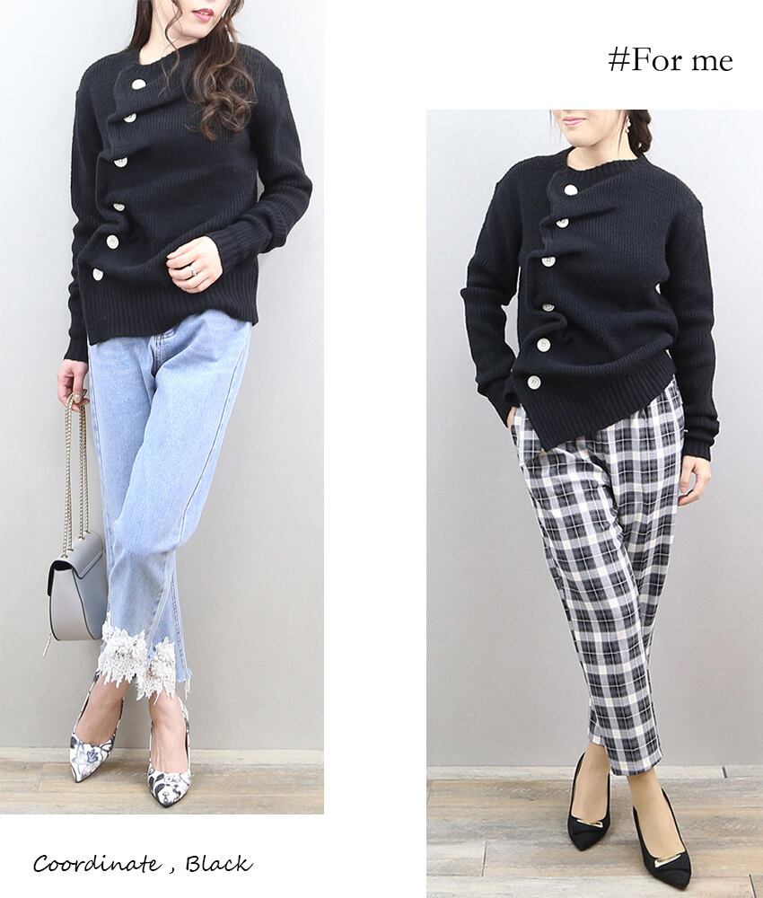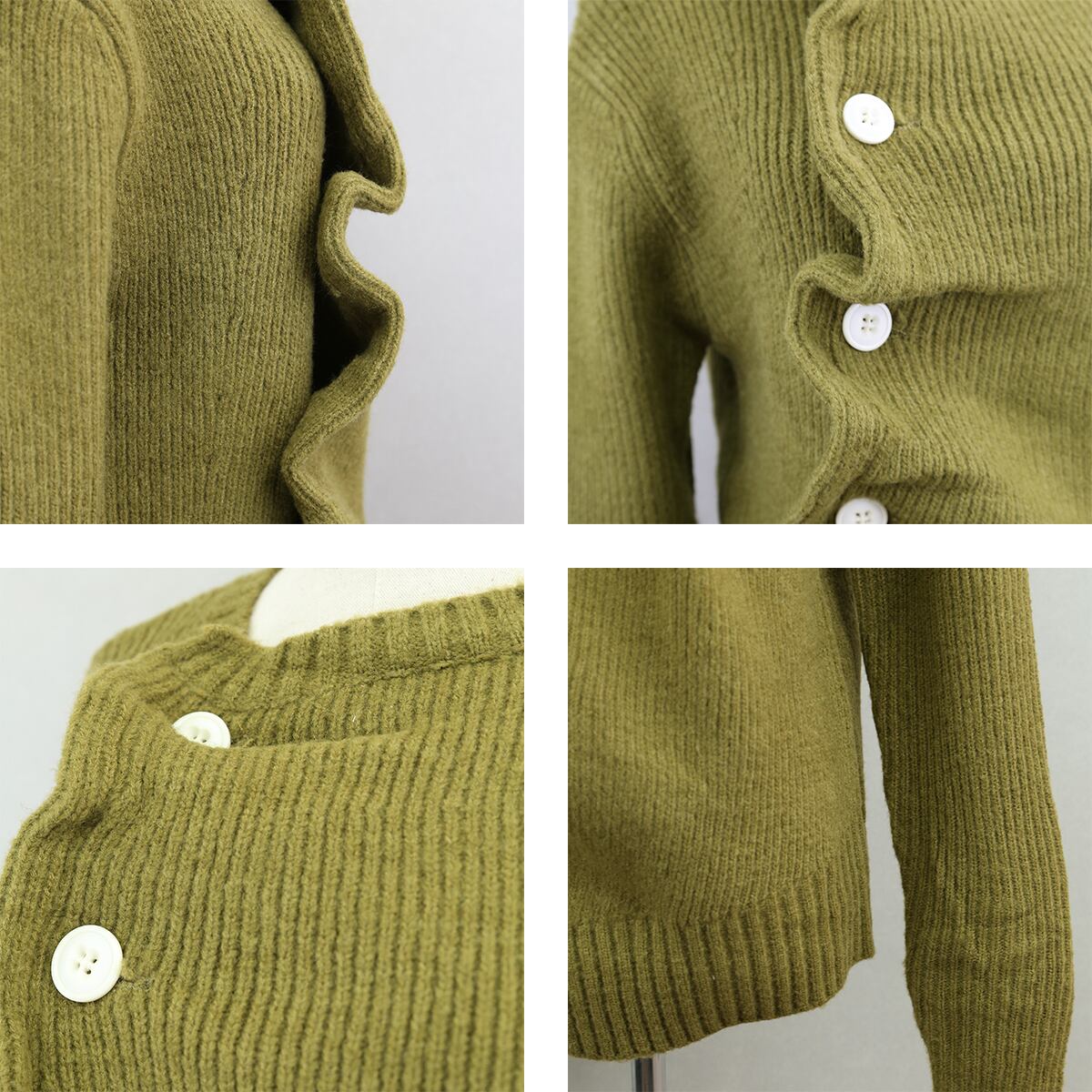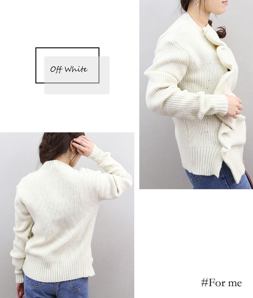斜めにデザインされた波打つフリルボタンが可愛らしさを引き立たせてくれます。袖が長く、華奢な女性を作り出してくれます。ボタンを掛け違って止めても可愛いです。ボタンを開けてカーディガンとしても着用できます。