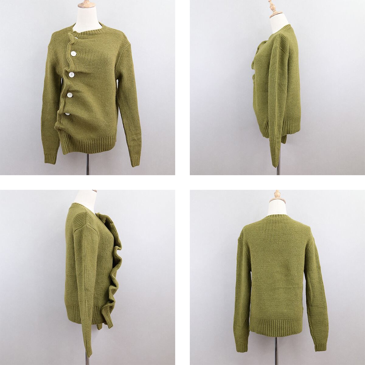 斜めにデザインされた波打つフリルボタンが可愛らしさを引き立たせてくれます。袖が長く、華奢な女性を作り出してくれます。ボタンを掛け違って止めても可愛いです。ボタンを開けてカーディガンとしても着用できます。