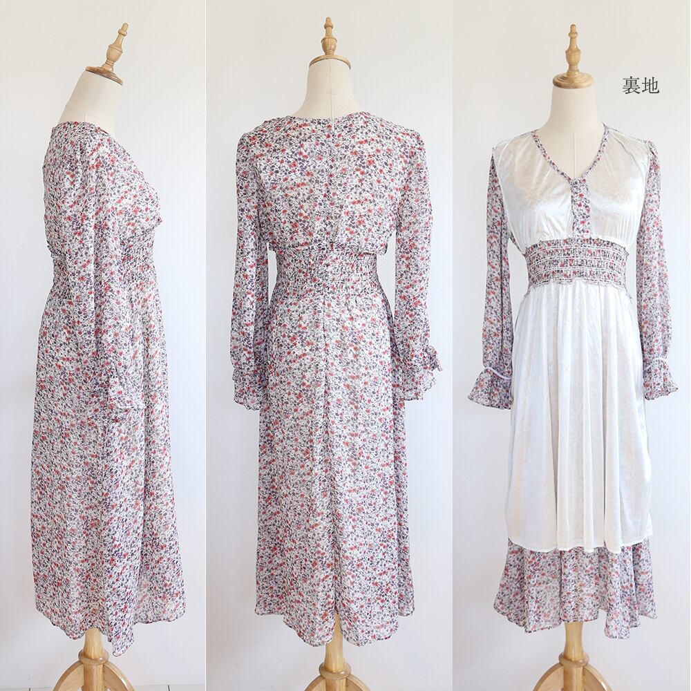 繊細な花柄にハイウエストが絞られたワンピース。スタイル良く表現してくれます。胸元のボタンや袖の絞りも、女性らしさを最大限に際立たせてくれるアイテムです。