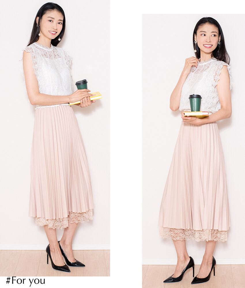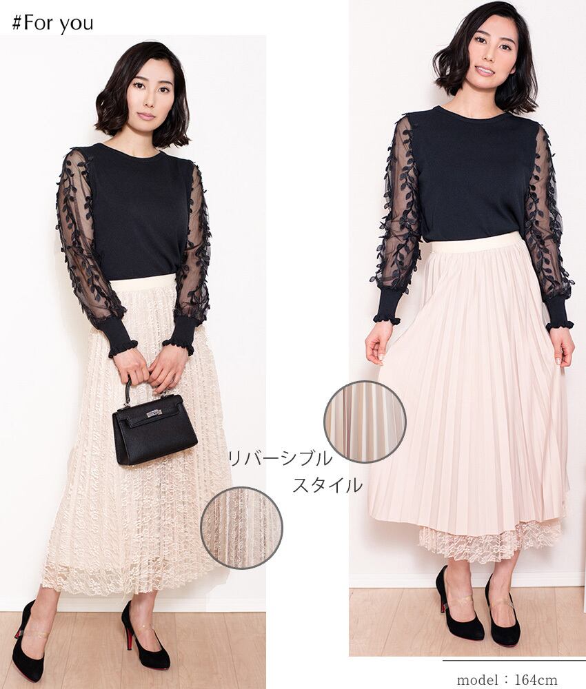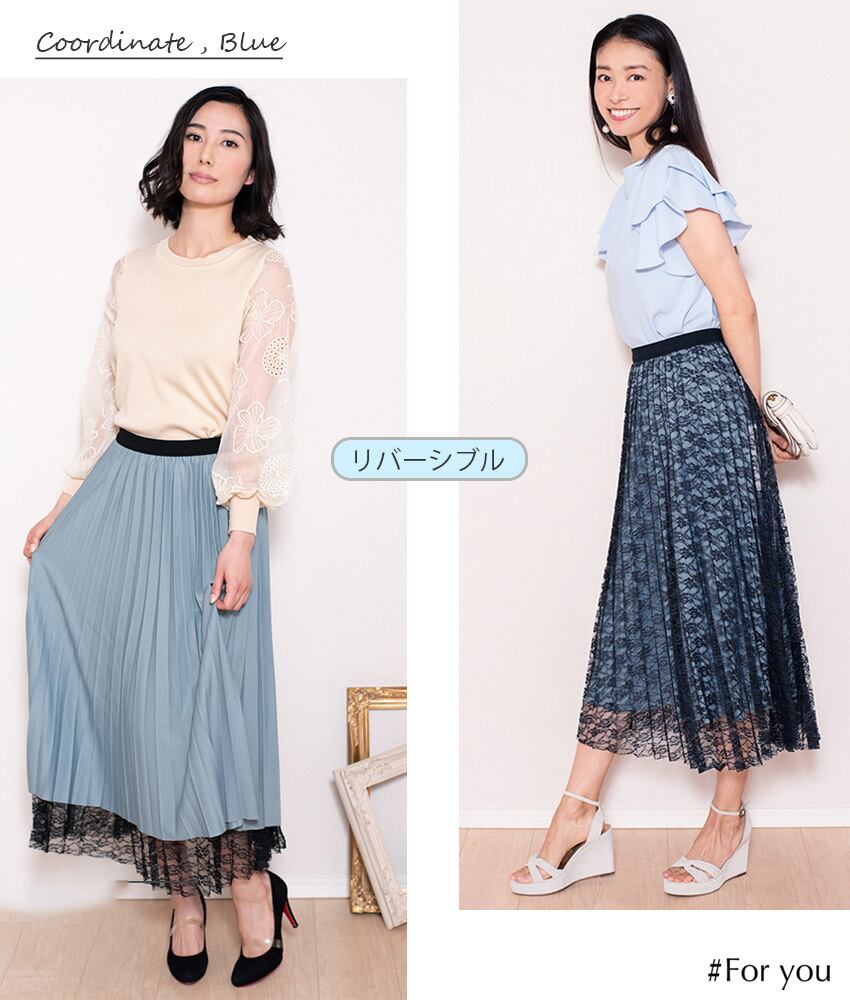 コーディネートに合わせて、スカートのデザインを楽しめるリバーシブルスカート。レースの見せ方でガラッと雰囲気が変わります。春色が揃ったカラーバリエーションも嬉しい!!