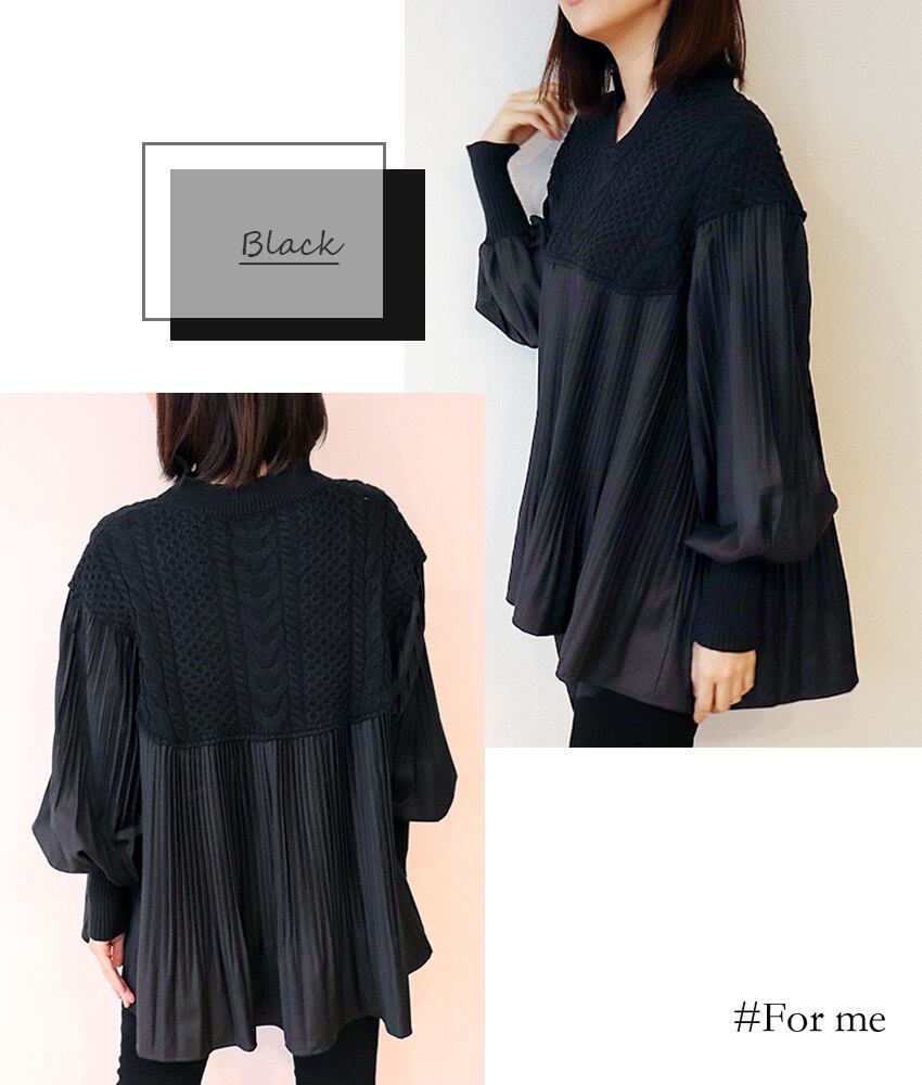 異素材が重なったプルオーバー。デコルテ部分はあったかニット素材で、裾部分はくっきりとしたプリーツでフワッとした女性らしいスタイルに。