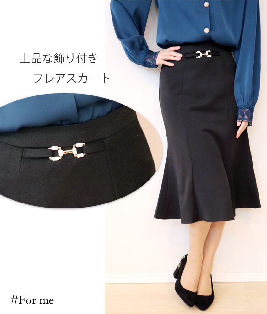 ウエスト部分にワンポイントの飾りがついたフレアスカート。フレアが広がっているので、綺麗なシルエットに見せてくれます。タイトスタイルとフレアの融合が、メリハリある形に。
