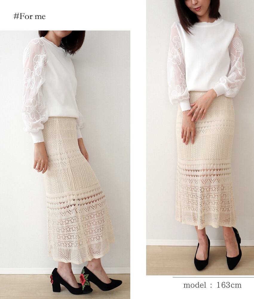 編みレースのロングスカートで、女性らしい優雅なスタイルを演出しましょう。