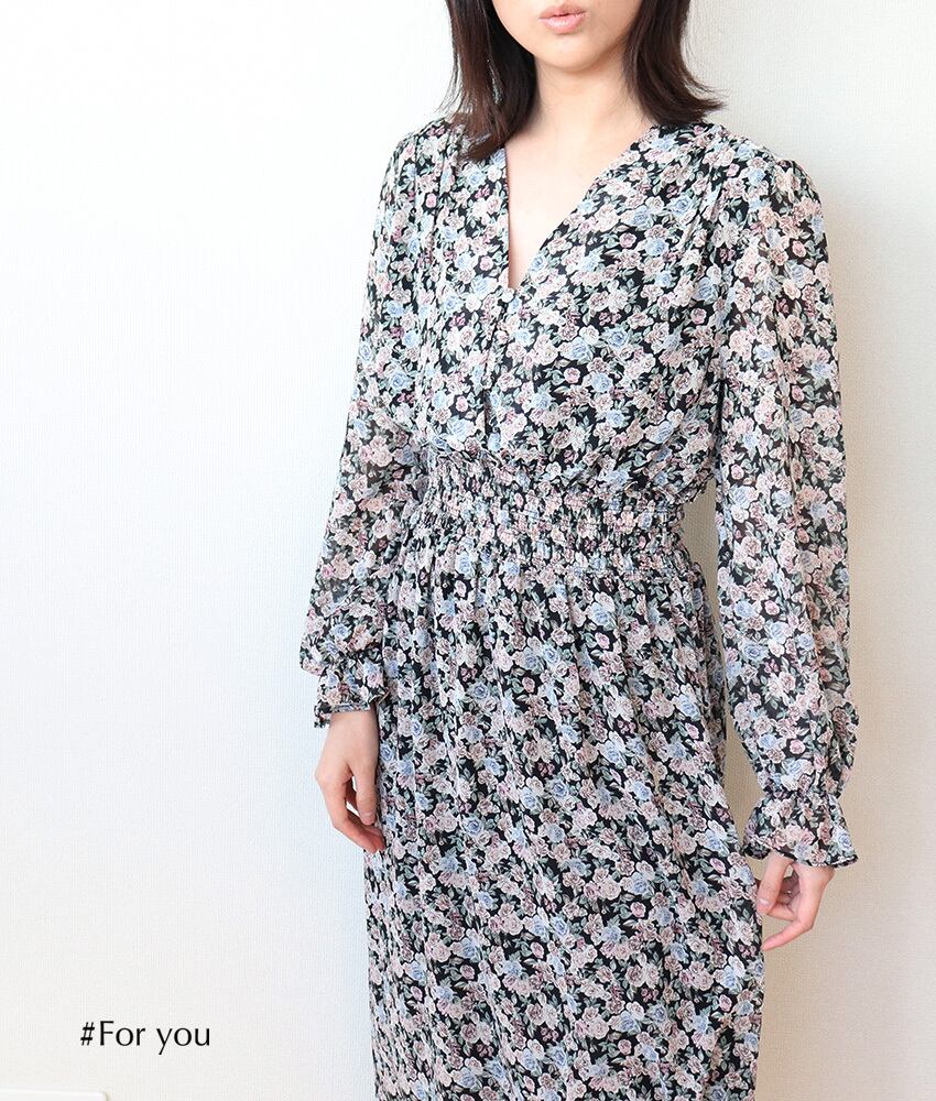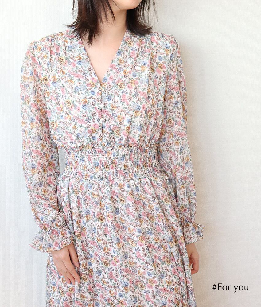 小花柄に包まれた可愛らしい春ワンピ。ウエストの絞りがスタイルアップに♪胸元のボタンも小さくて華奢な女性の雰囲気を作ってくれます。