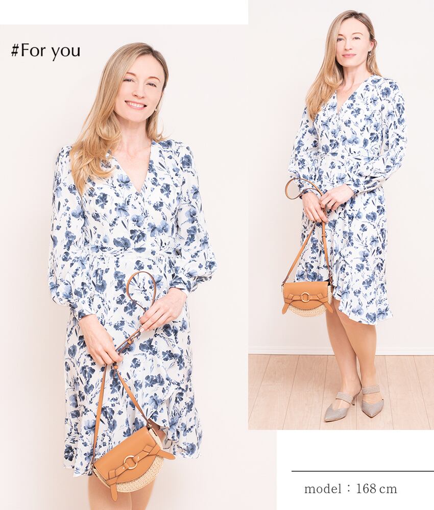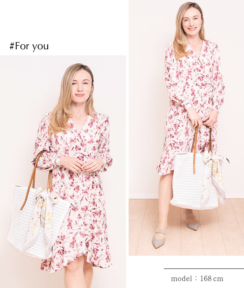 フロントのひらひらと花柄がエレガントなシルエットに。後ろの腰部分に穴が空いており、片方のベルト紐を内側から出して着用します。華やかでオトナな印象になります。