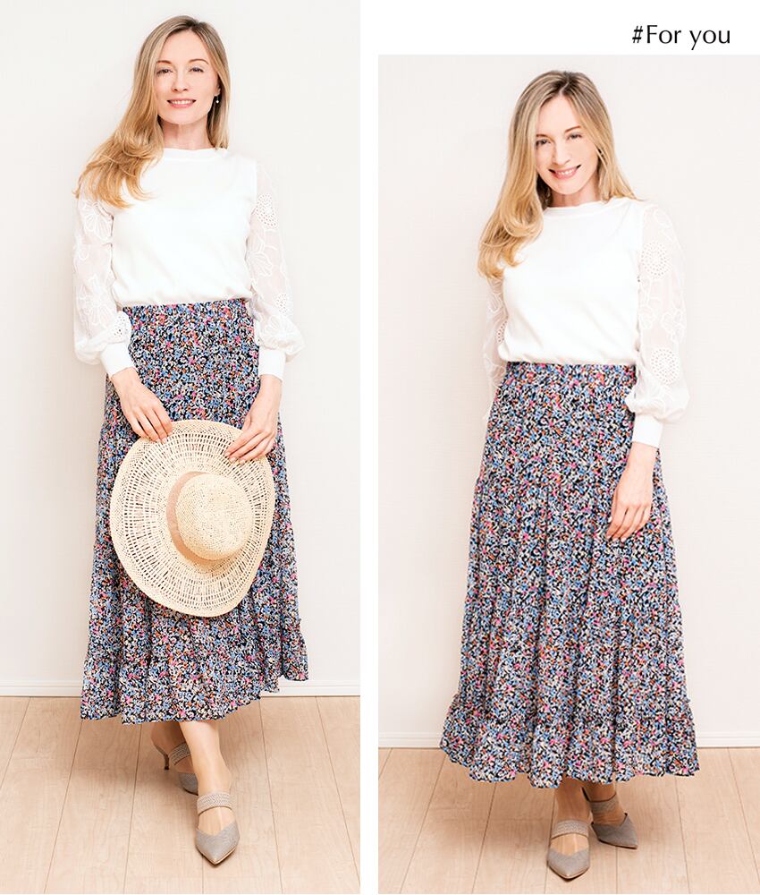 小花柄の女性らしいデザインに、フリルの可愛らしさがプラスされたスカートは、一枚で華やかなコーディネートが完成します。