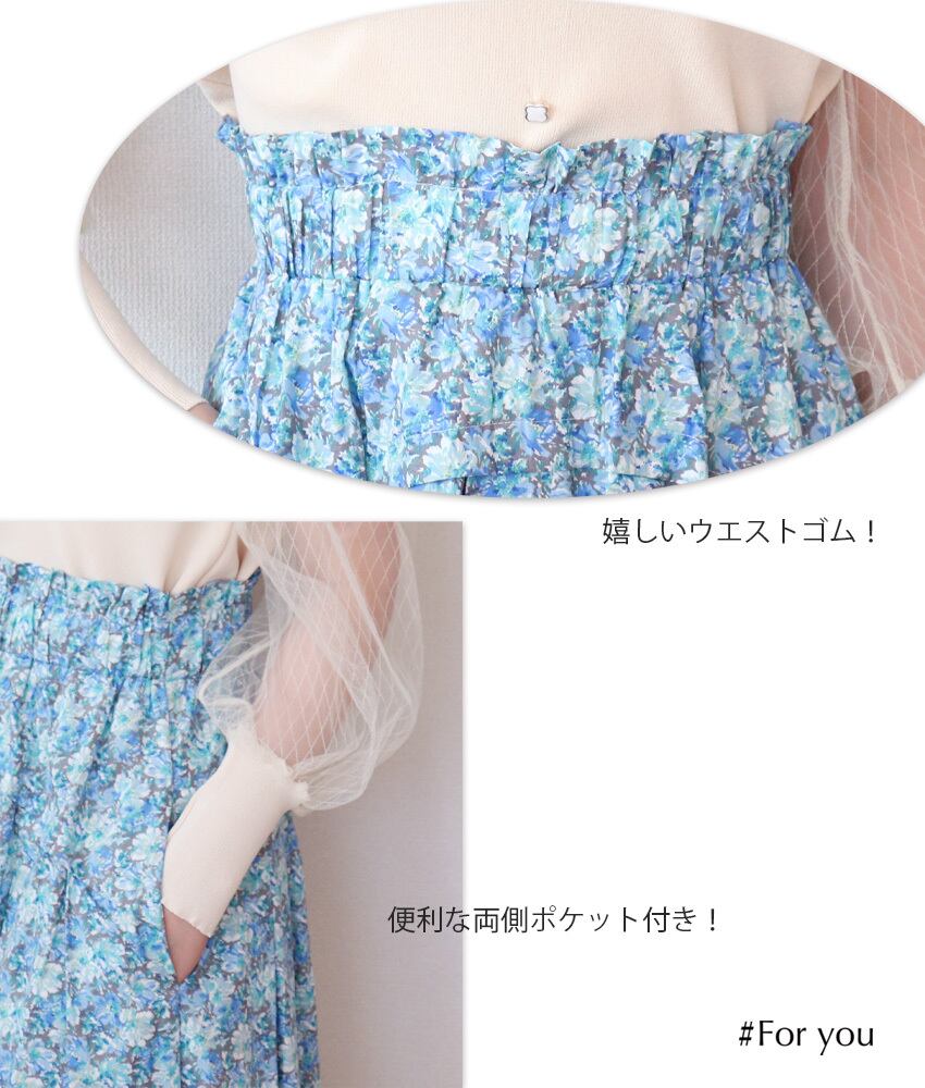 鮮やかな色合いのスプリングサマースカート。1枚あるだけで華やかな印象に。ふんわりとしたデザインで、ポケット。ウエストゴムも嬉しいアイテムです。