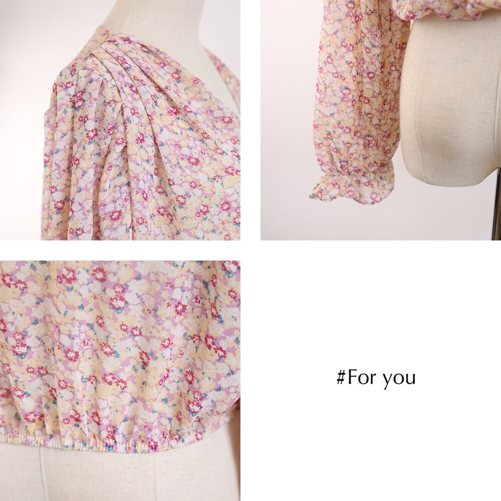 透け感×花柄の春夏の必須アイテム。サラッとした生地感が涼し気な雰囲気に。胸元にボタンがあり、斜めデザインになっています。短めの着丈で裾はゴムになっているので、スタイルアップにもなります。