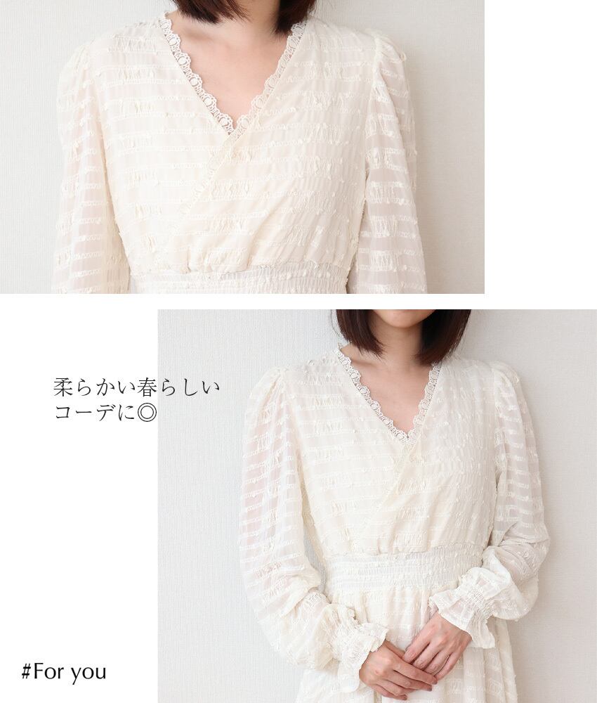 柔らかいクリーム色のパステルワンピース。Vネックが小顔効果もあり◎ウエストの絞りデザインも引き締め効果あり◎細かなデザインが女性らしさを引き立たせてくれます。