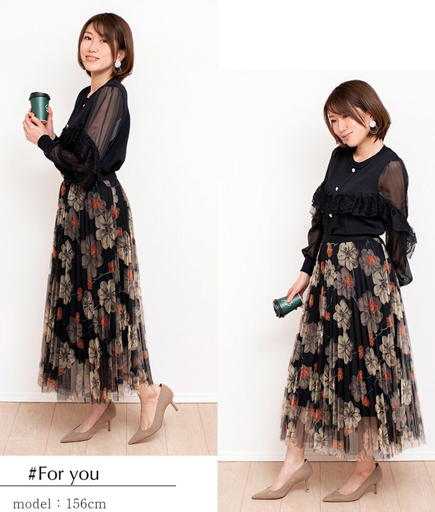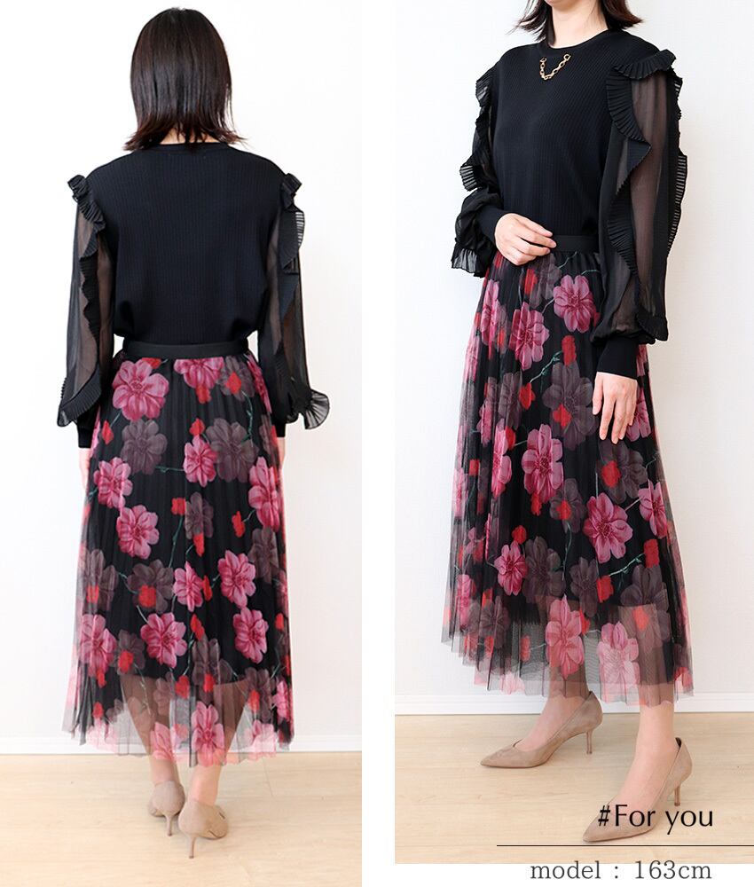 大胆で華やかな大花柄が揺れるチュールスカート。広がるフレアシルエットが女性らしい印象を演出します。夏にぴったりの明るいカラーバリエーションも豊富で、コーディネートのアクセントとしても活躍します。