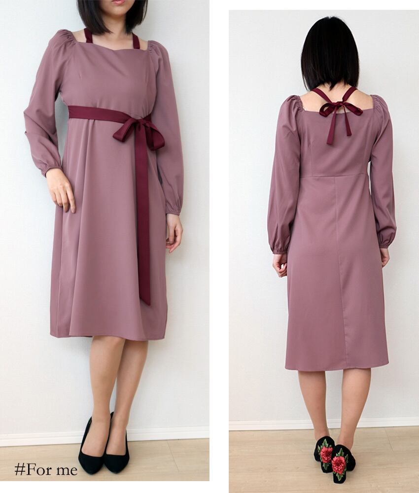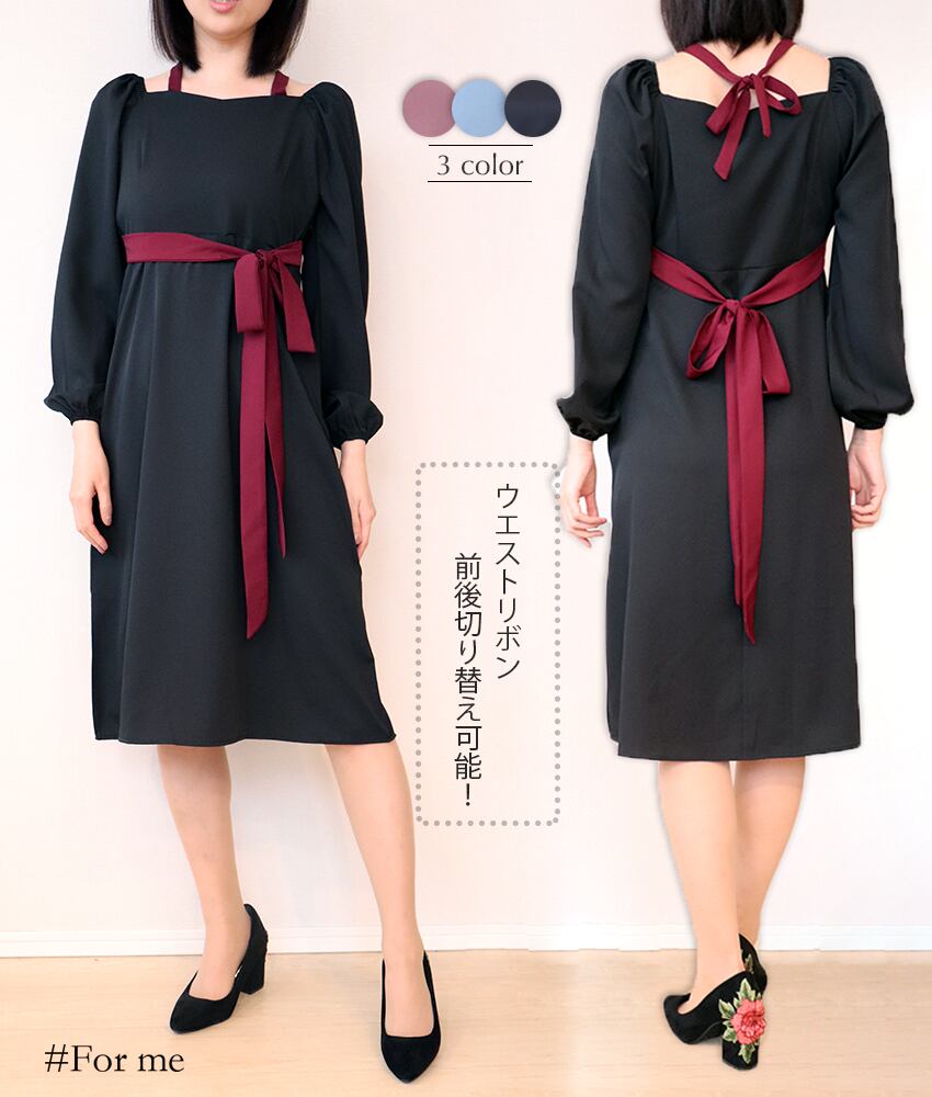デコルテ部分とウエスト部分の紐・ベルトが目を惹く清楚ワンピース。デコルテ部分は大きく開いているので、首元すっきりと春コーデに最適です☆左側にファスナーがついた、綺麗なラインを作ってくれるワンピースです。