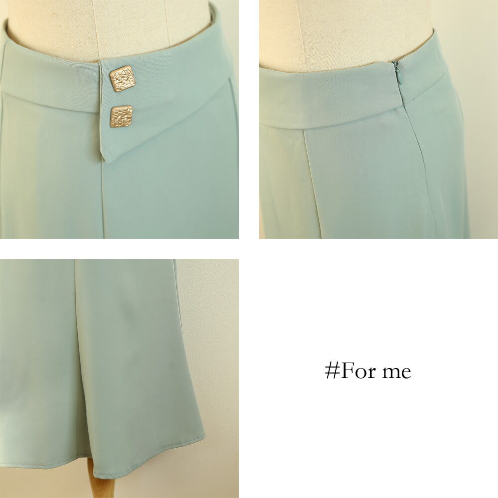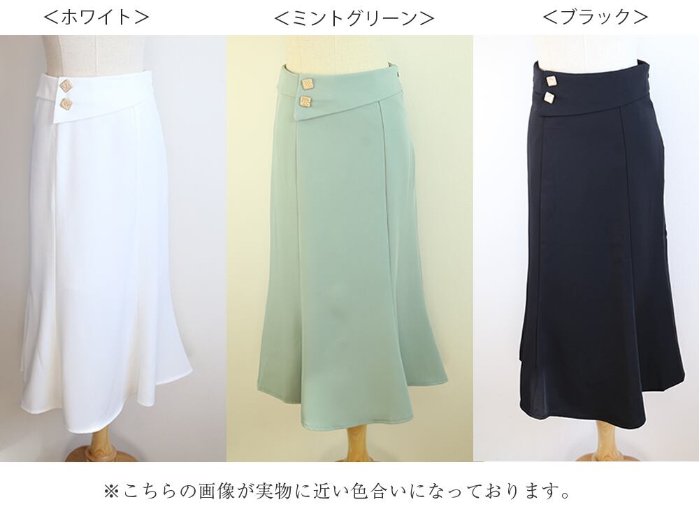 やや伸縮性のあるしっかりとした生地感の膝丈ワンピース。タイトデザインからの裾のフリルが可愛らしさを+ウエストのダブルボタンのデザインがキッパリ感を演出。