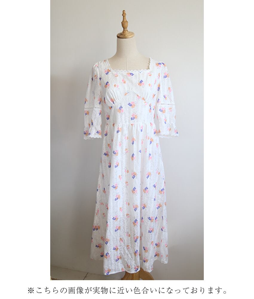 白地+淡いピンクの花柄というお姫様のようなワンピース。しっかりとした生地感、裏地もついているので、透ける心配もありません。