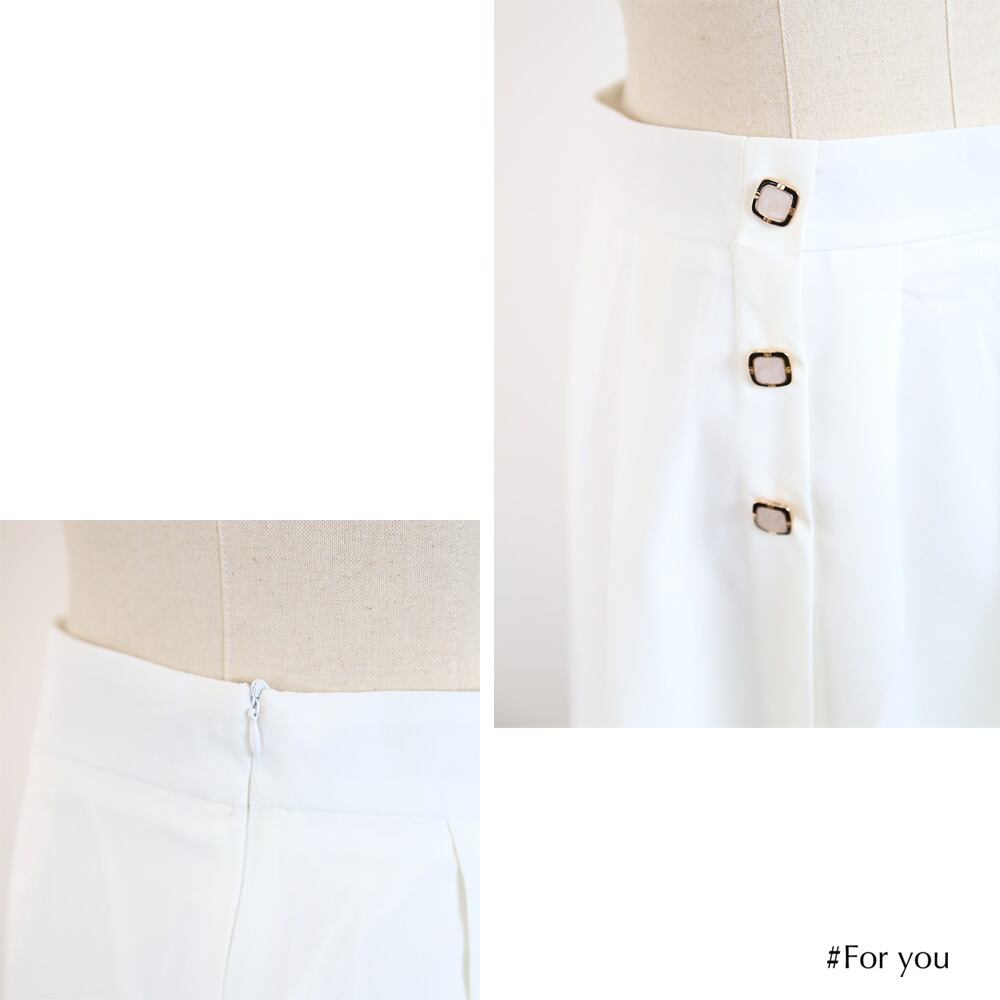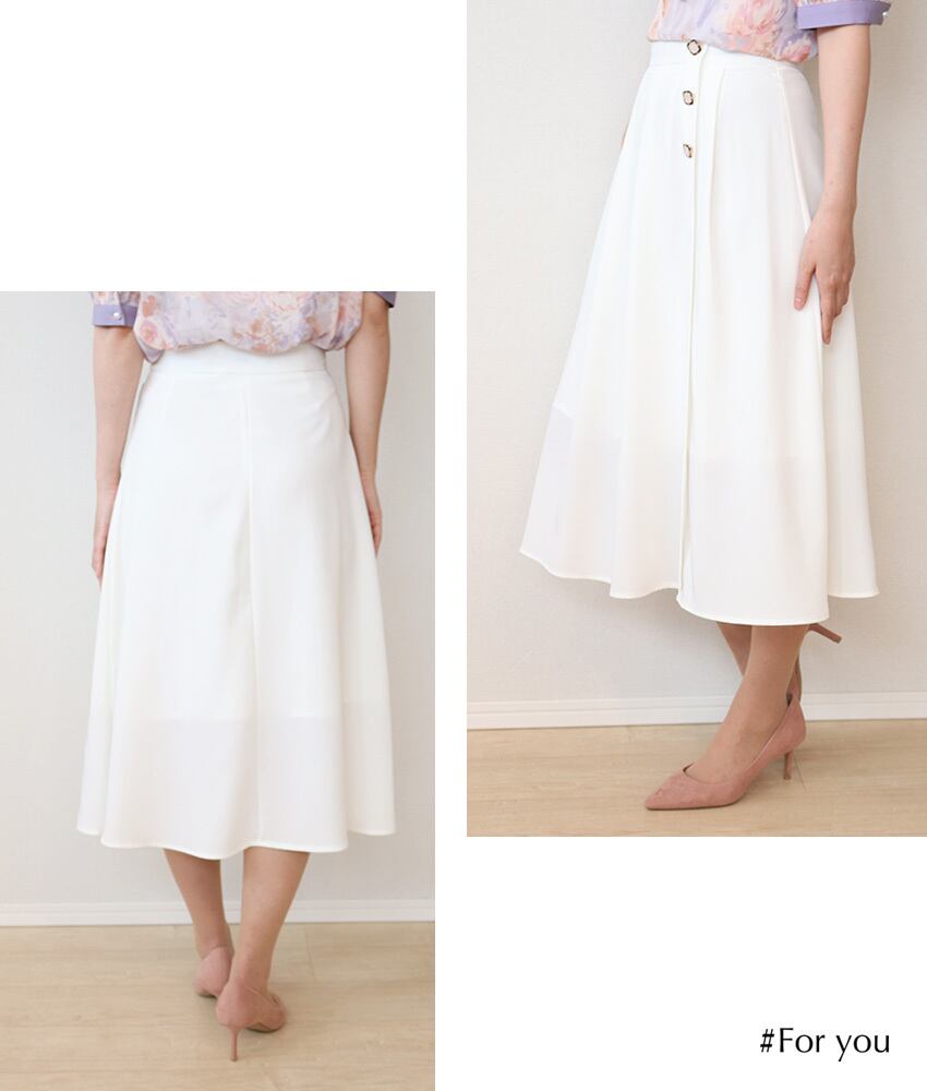 白いボタンが3つ付いたフレアスカート。シンプルの中にアクセントが映えます。同色のトップスと合わせると、コーディネートが完成します。