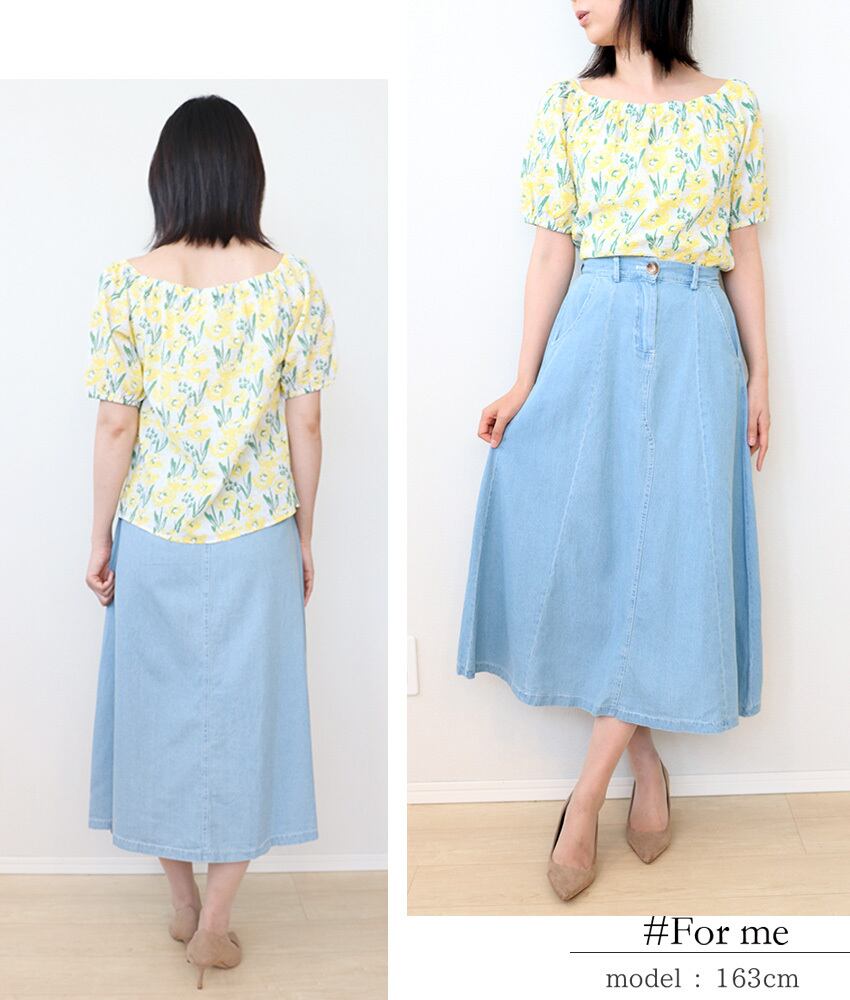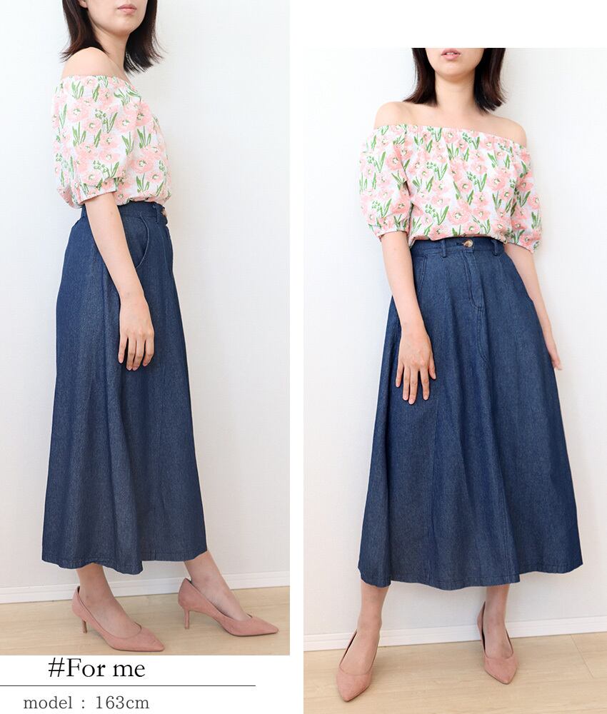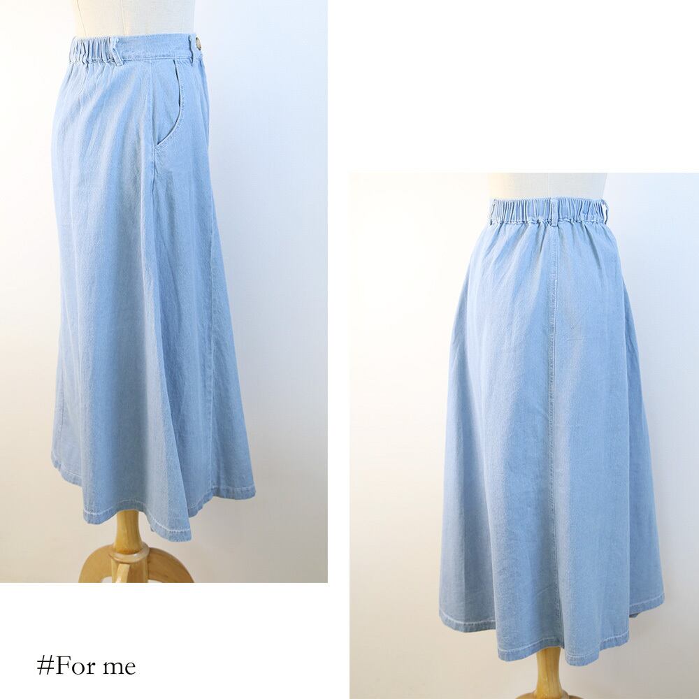 足首まで丈感が嬉しい、デニムスカート。ウエストはゴムなので、S~Mサイズで着用できます。裏地はありませんが、薄すぎないしっかりとした生地感です。