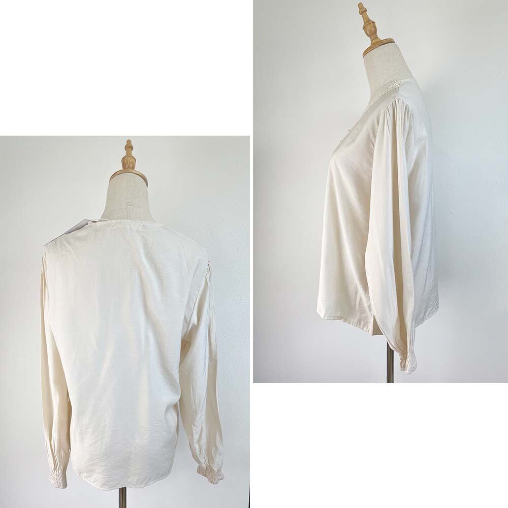 淡い色合いの薄手トップス。胸元のY字レースデザインと袖口デザインが涼し気で女性らしさを表現。カジュアルな普段着にばっちりです。
