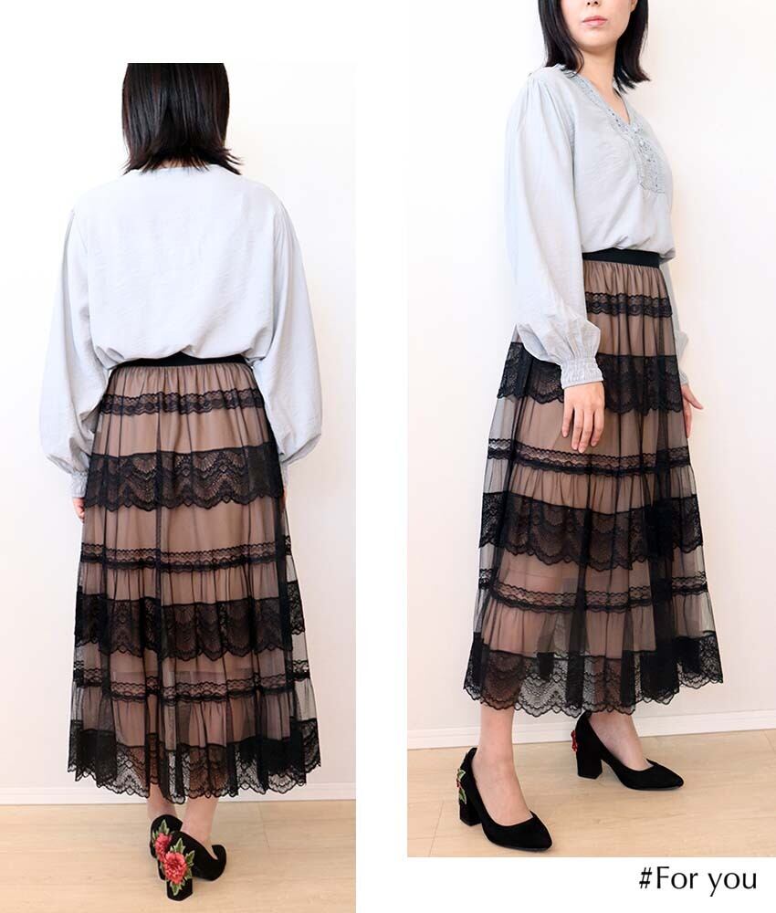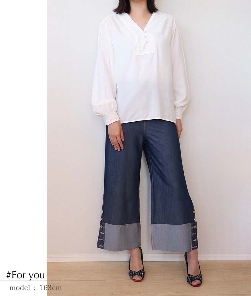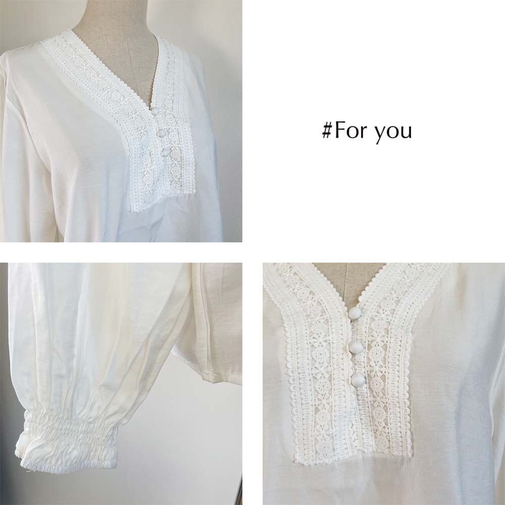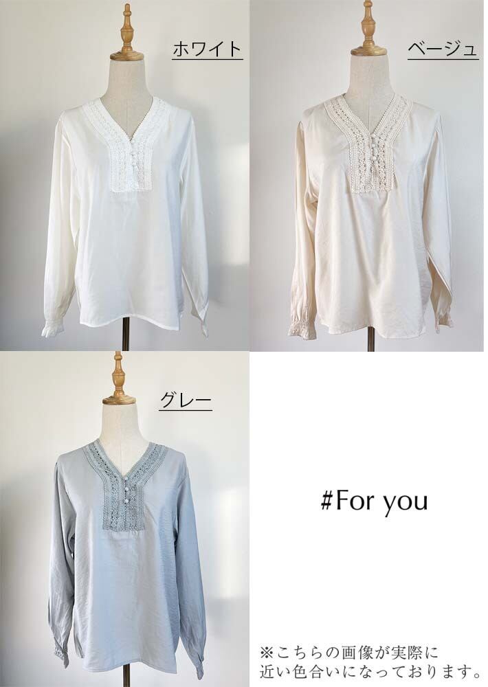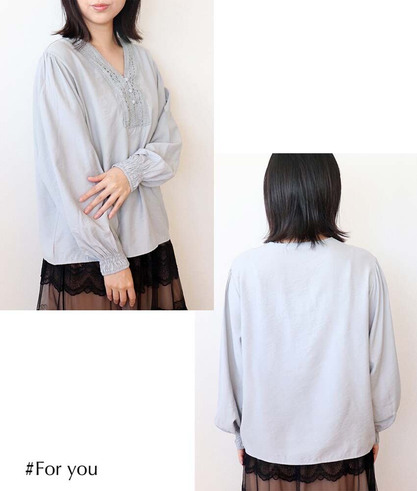 淡い色合いの薄手トップス。胸元のY字レースデザインと袖口デザインが涼し気で女性らしさを表現。カジュアルな普段着にばっちりです。