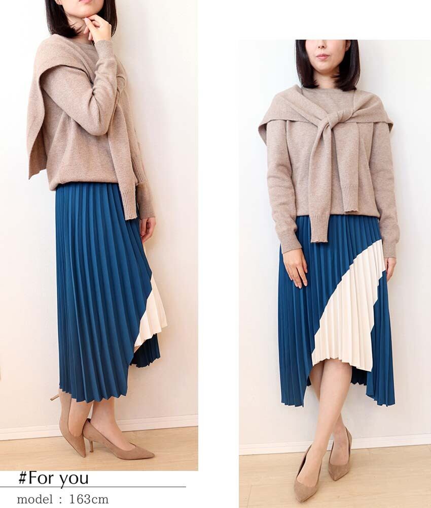 フロントが膝丈にアップされたメリハリあるプリーツスカート。ホワイトの挿し色が爽やかで目を惹きます。前後で雰囲気がガラッと変わるスタイルです。