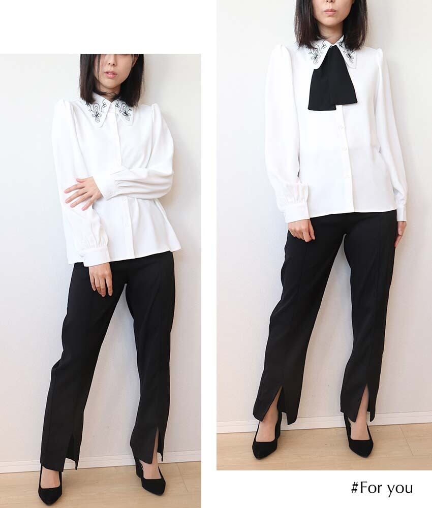 ホワイトブラウスの襟につた柄の刺繍がされたシックなアイテム。黒のボウタイは取り外し可能で着用でき、アクセントになります。