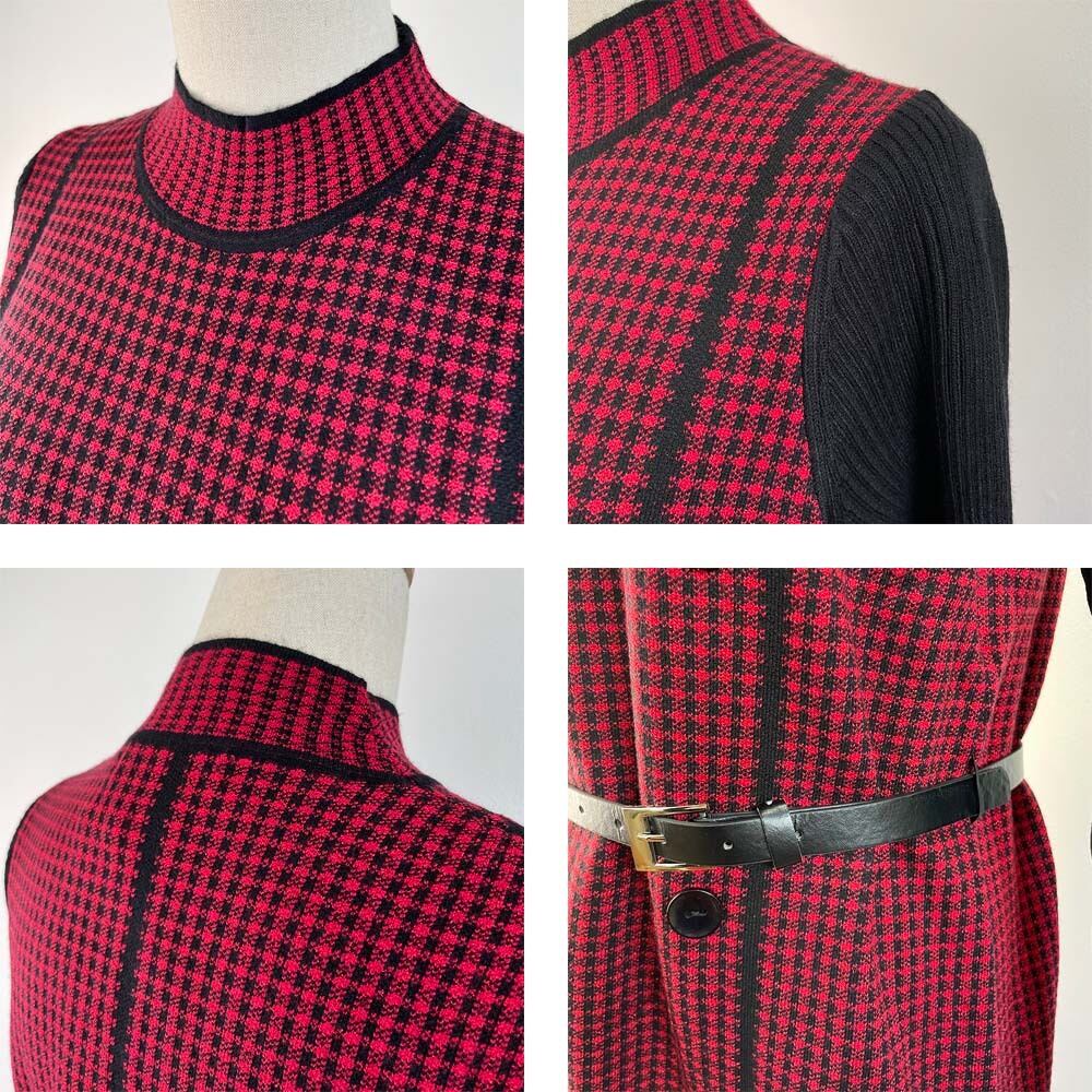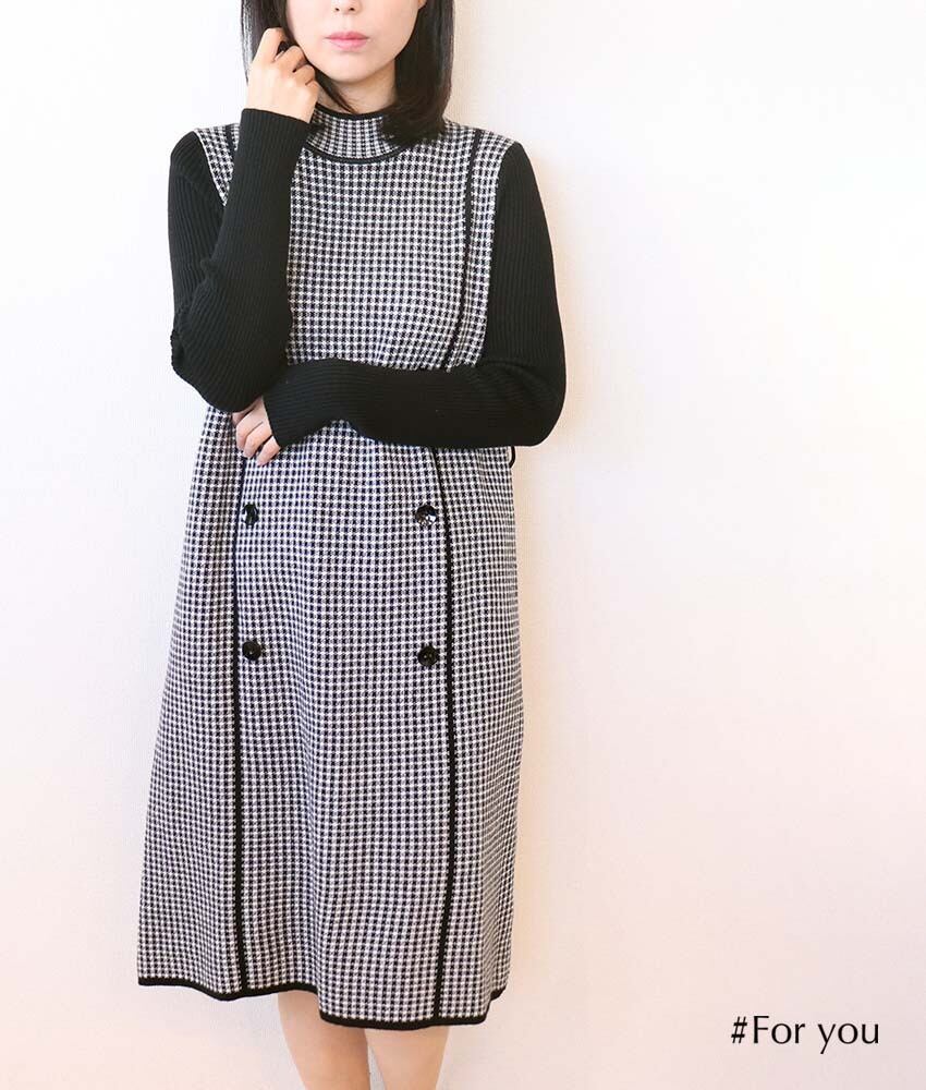 細やかなチェック柄で埋め尽くされたニットワンピース。黒縁がくっきりと入り、カッコいい印象に。ボタン&ベルトも引き締まった見栄えになります。