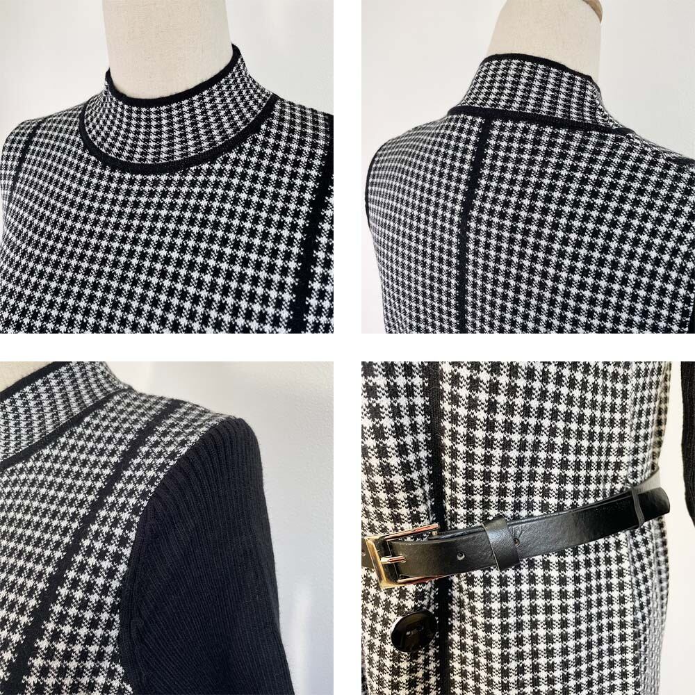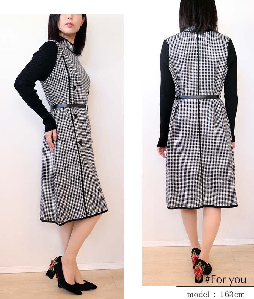 細やかなチェック柄で埋め尽くされたニットワンピース。黒縁がくっきりと入り、カッコいい印象に。ボタン&ベルトも引き締まった見栄えになります。
