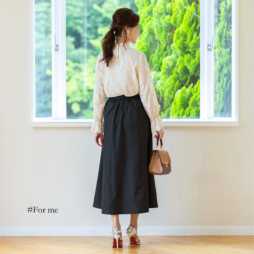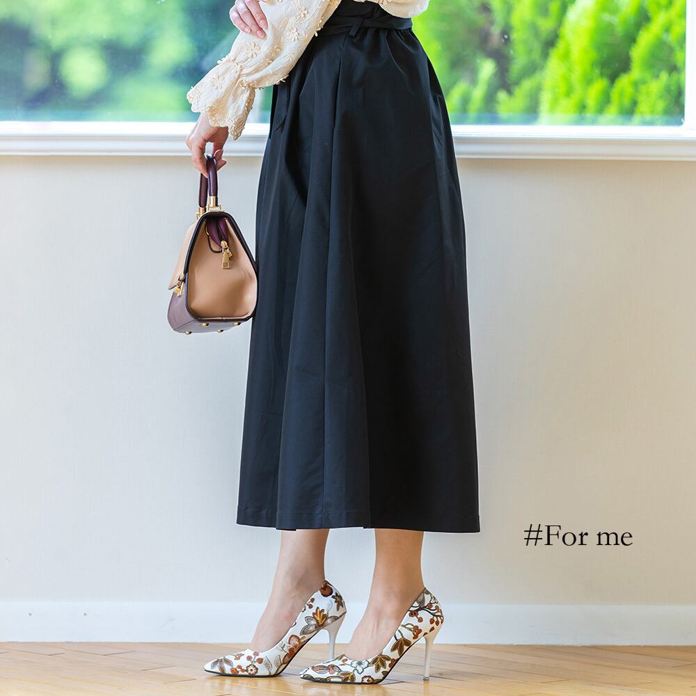 しっかりとした生地のトレンチスカート。シワになりにくく、履き心地も抜群です。フロントボタンがカジュアルスタイルに、ウエストがゴムなのでぴったりフィットします。