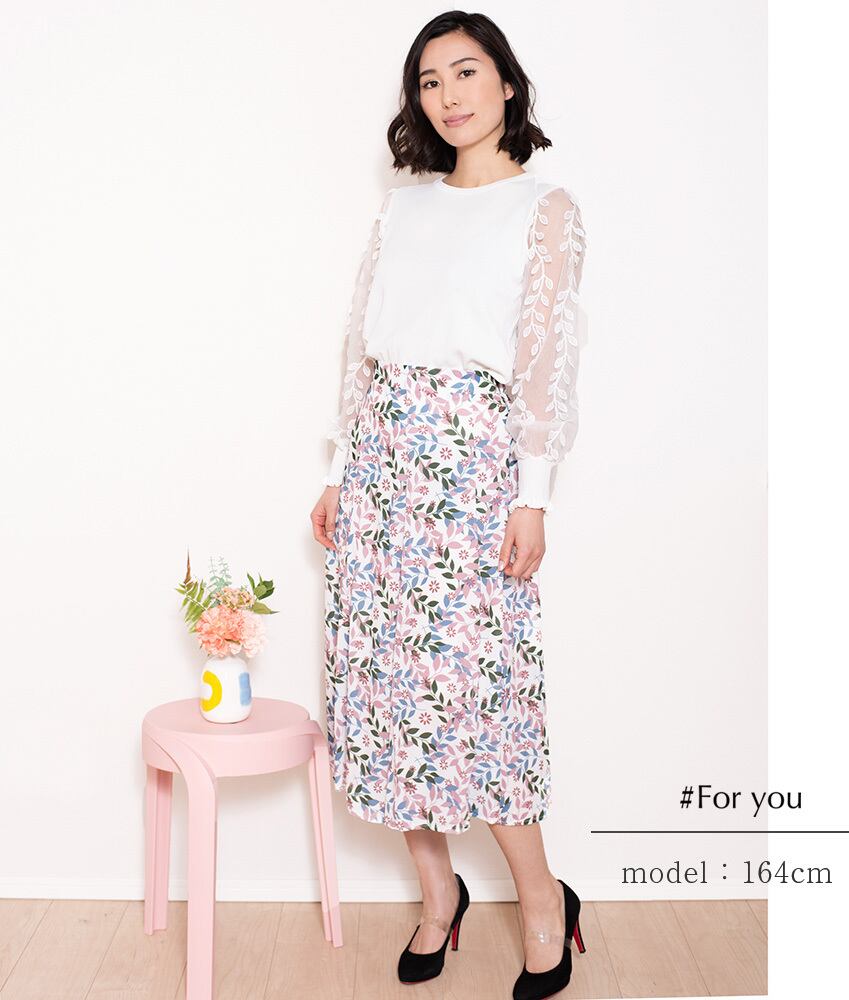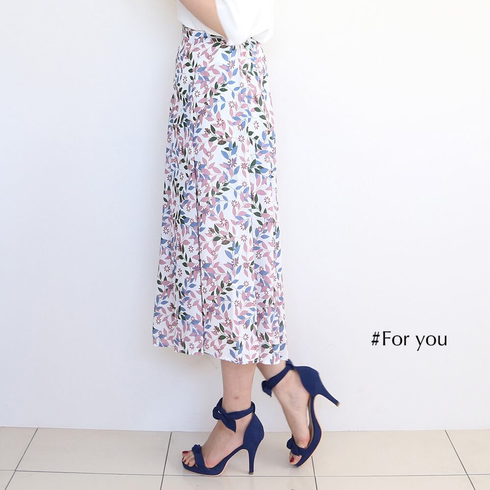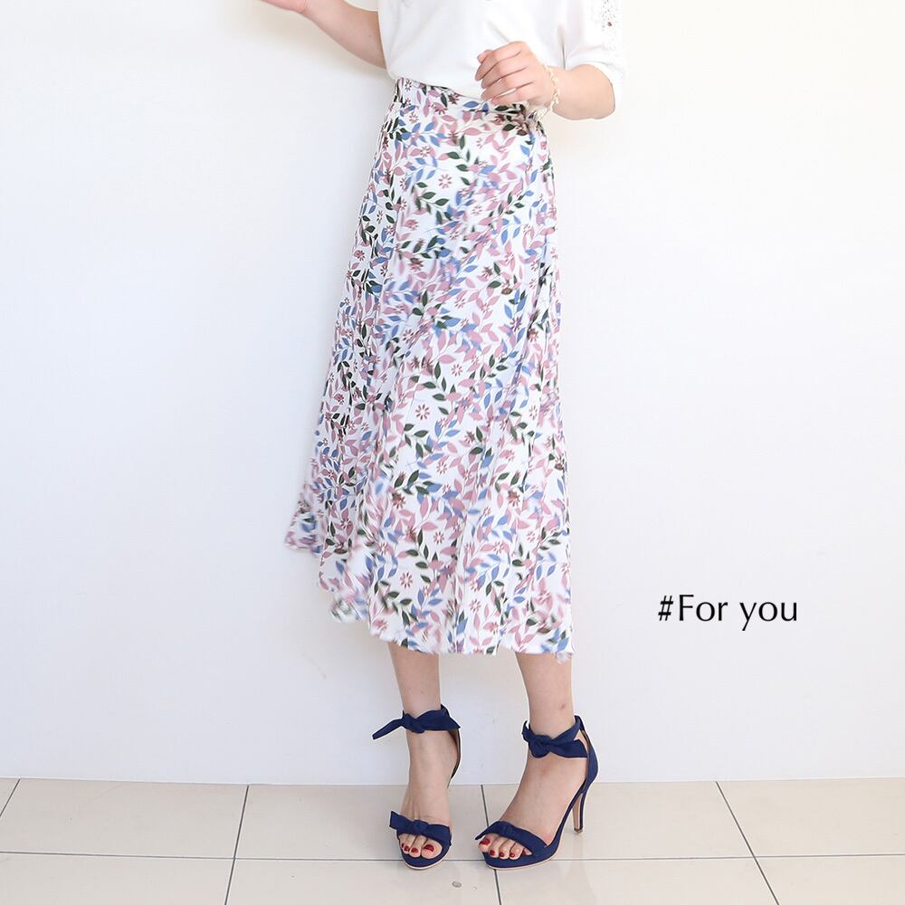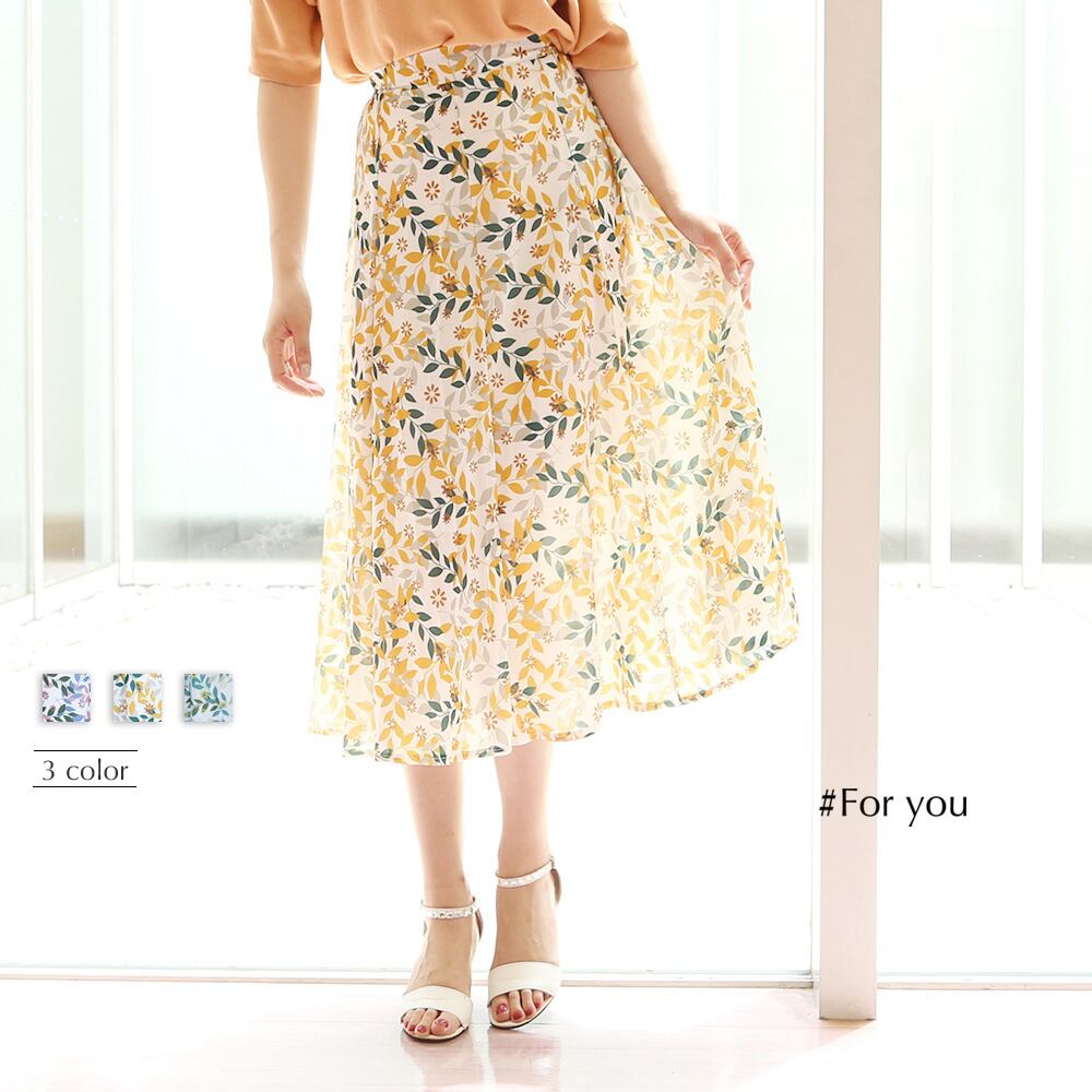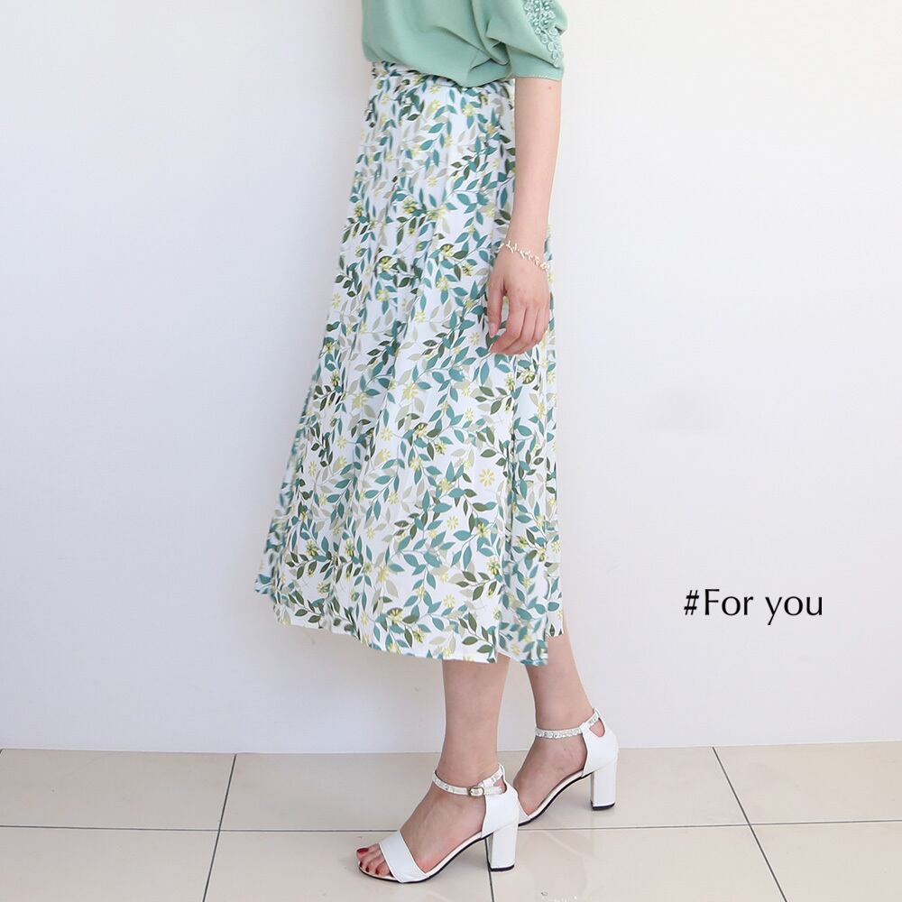 爽やかな葉っぱ柄で埋め尽くされたフレアスカート。春夏らしいカラーが映えてキレイに着こなせます。ウエストの後ろ側にはファスナーがつき、ゴムになっています。裏地もしっかりとついています。