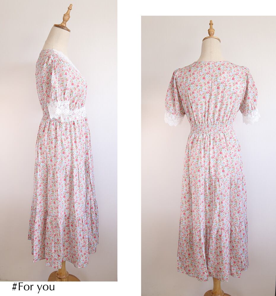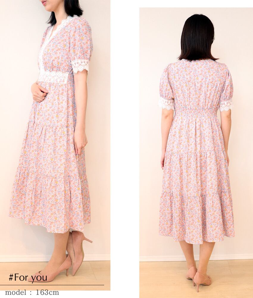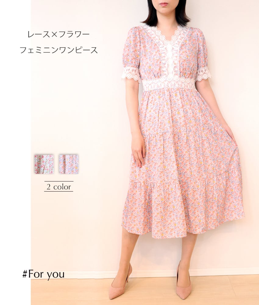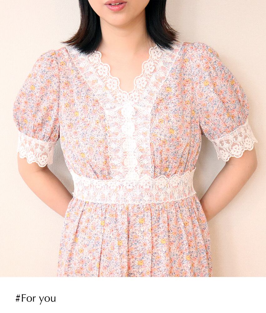 春夏コーデにぴったりの花柄ワンピース。白のレースが目を惹くフェミニンな印象に。V字の胸元は小顔効果も☆
