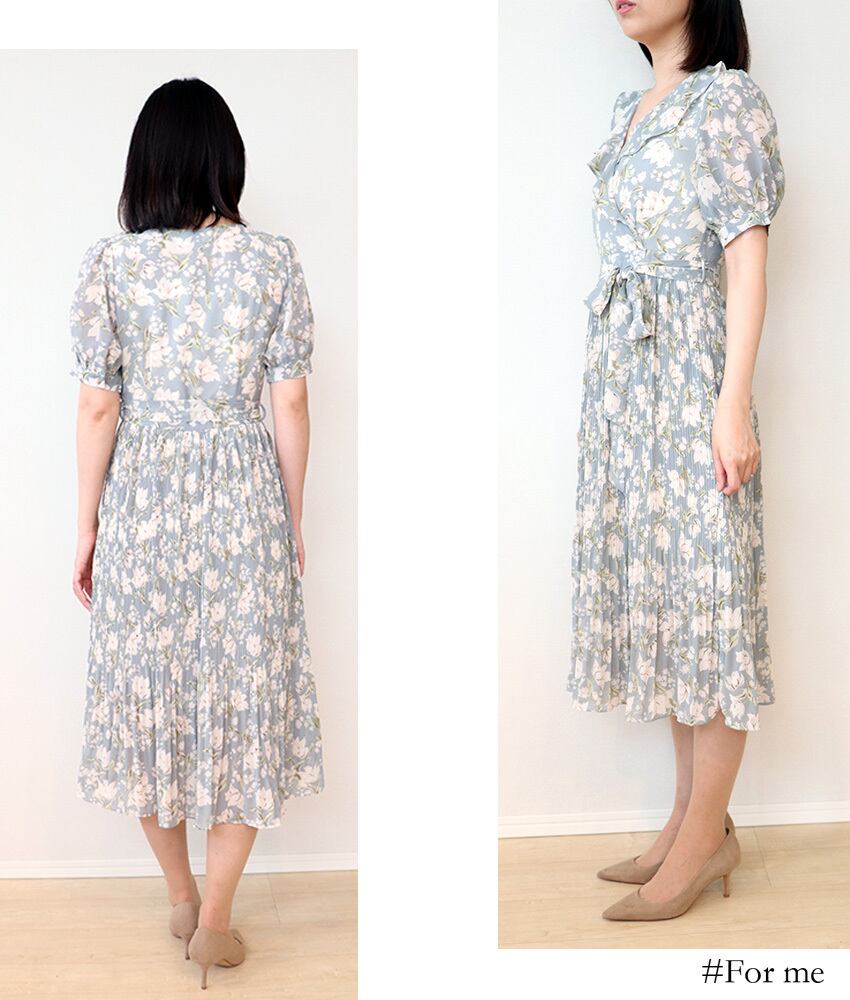 上品な花柄がデザインされたワンピース。胸元のフリルも華やかな印象に。スカート部分は細やかなプリーツになっていて、華奢感を演出してくれます。