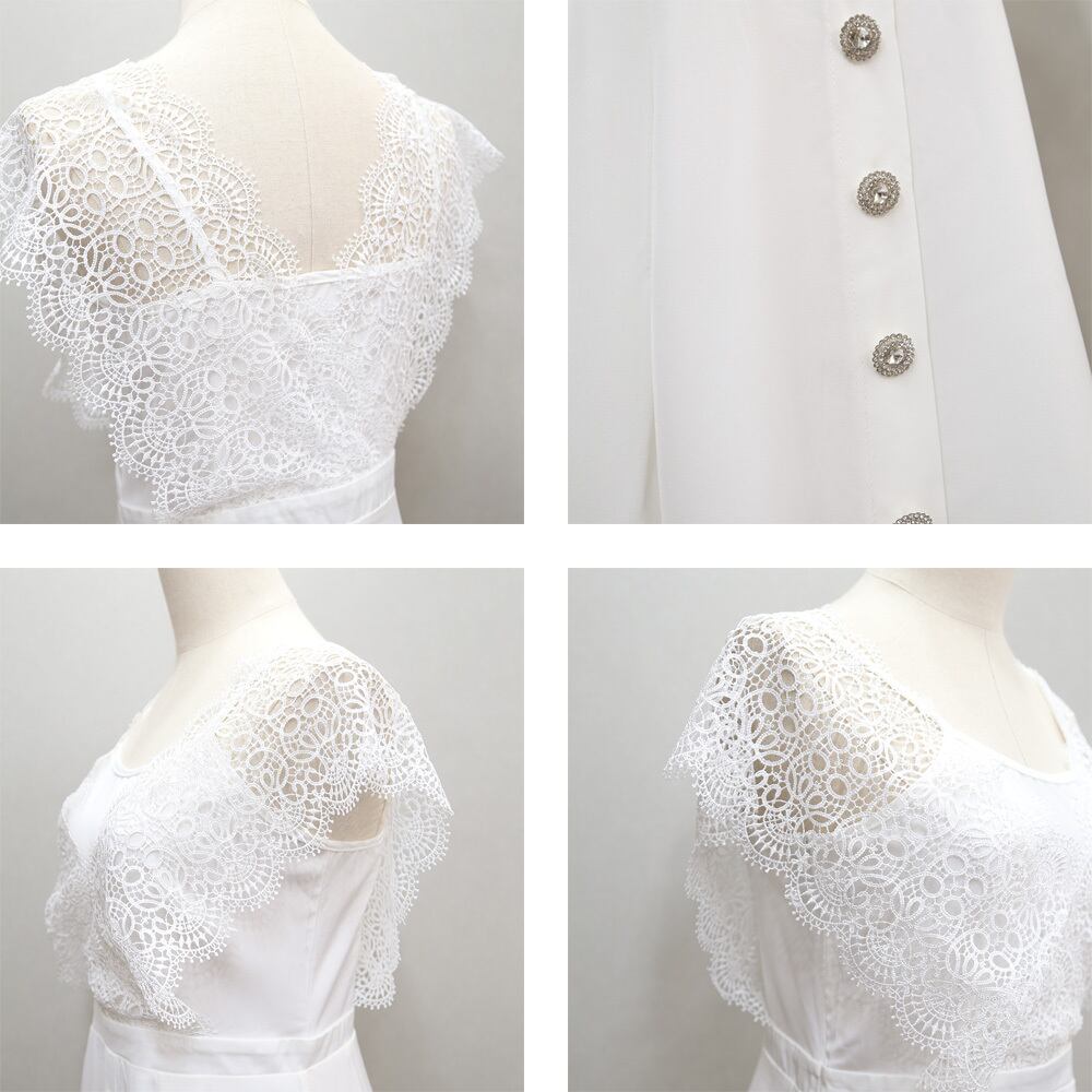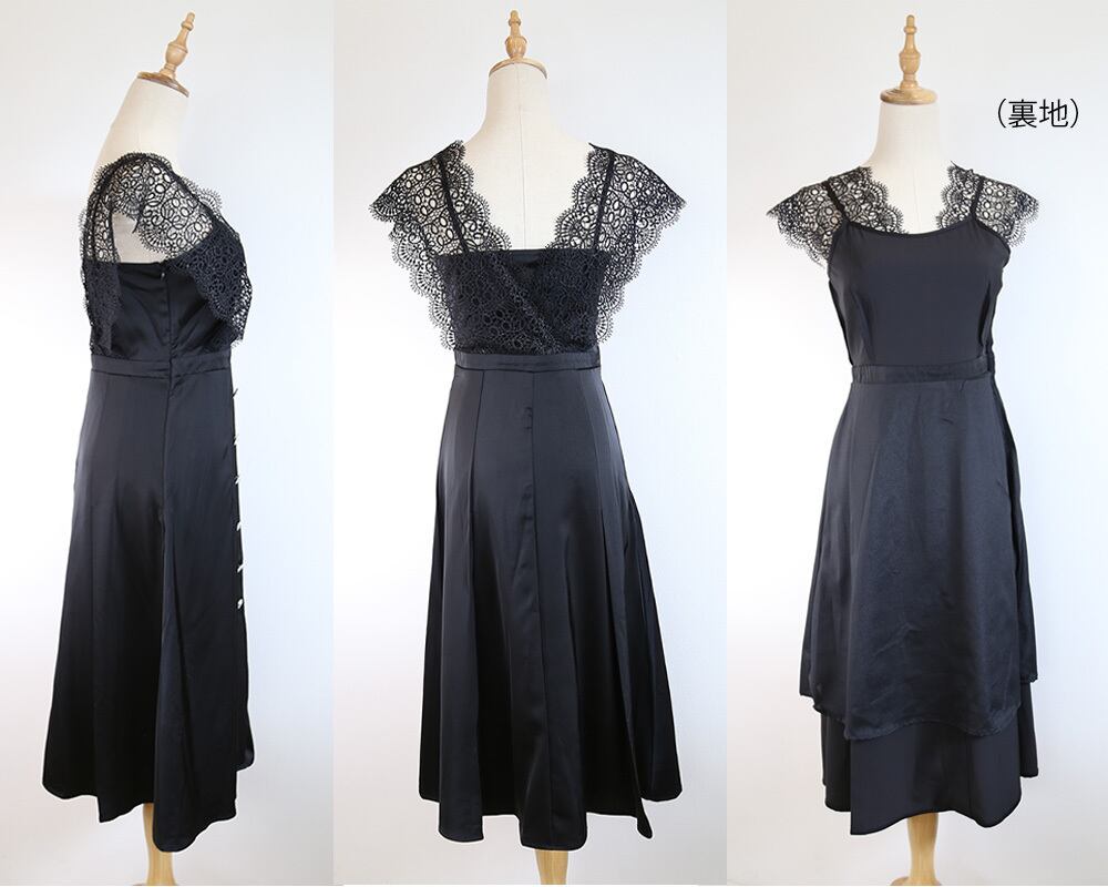 華やかなレースがショルダー部分に大きくデザインされたキャミソールワンピース。フォーマルな場所でも、普段のオシャレ着にも使えます。スカート部分はしっかりとした生地感です。