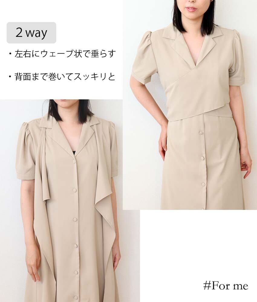 デコルテあたりから長くウェーブした生地を2wayスタイルとして着用できるワンピース。そのまま垂らしてエレガントな印象でもOK、後ろ側に巻いて清楚風に仕上げてもOK。フロントのボタンが可愛らしさを表現してくれます。