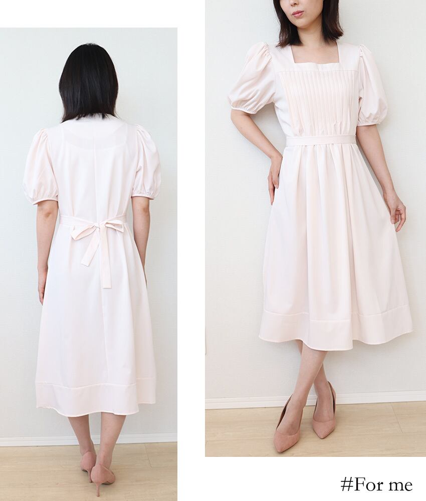 ボリューム袖が華奢な雰囲気を醸し出してくれるワンピース。胸元の縦プリーツも個性的。ベルト紐は自由自在にお好みの位置で調節可能です。