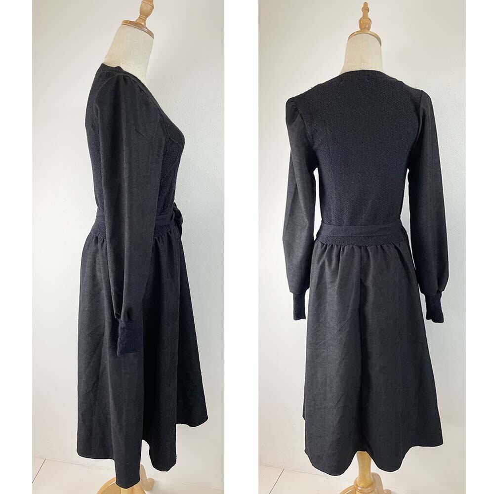甘い雰囲気漂うフレアワンピース。トップス部分だけニット素材、その他がスエード生地のオシャレワンピ。胸元のボタンもアクセントになります。付属のニットベルトを結ぶと、ウエストのメリハリがつきます。
