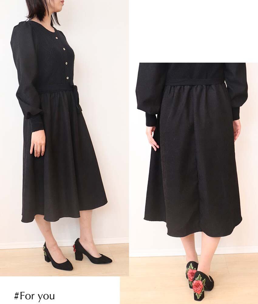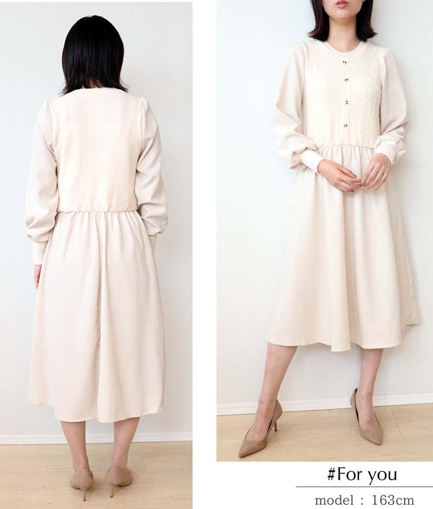 甘い雰囲気漂うフレアワンピース。トップス部分だけニット素材、その他がスエード生地のオシャレワンピ。胸元のボタンもアクセントになります。付属のニットベルトを結ぶと、ウエストのメリハリがつきます。