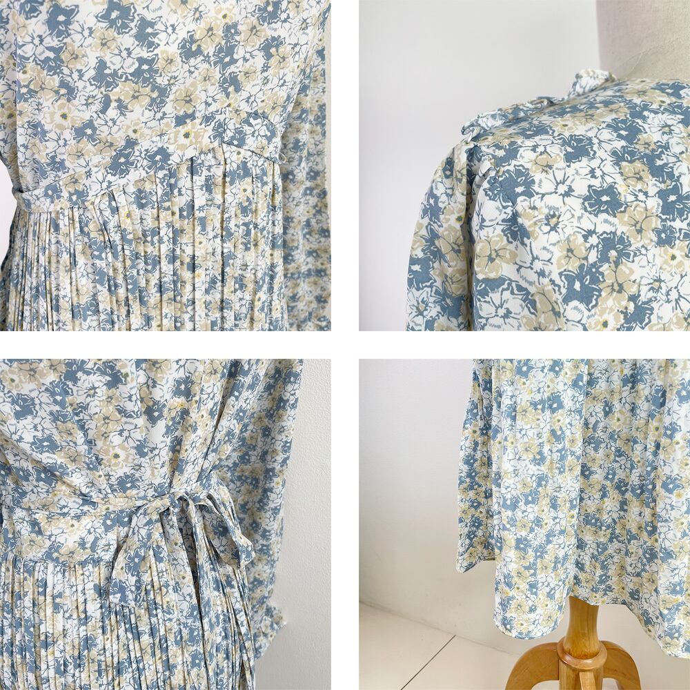 小花柄×プリーツが妖艶に揺れるワンピース。アーチ形のドッキングスタイルと、プリーツの変化が自分流に表現してくれる春アイテムです。